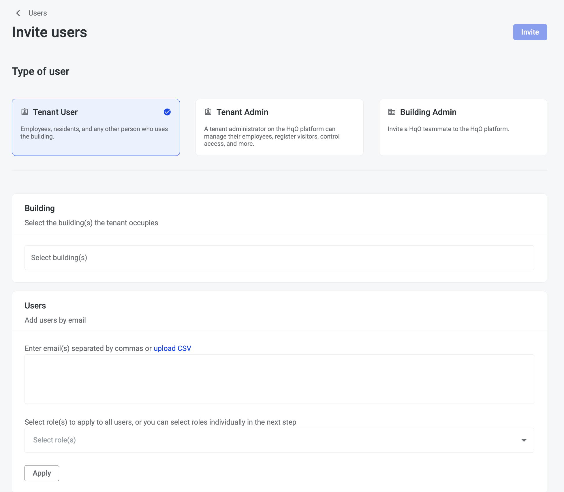 HqO’s invitation flow simplifies the process of inviting new users to the platform by providing a guided interface for tenant and landlord administrators. Designed to replace the cumbersome CSV upload tool, this new feature offers role-specific invite paths, role and building assignment during the invite process, and bulk upload functionality. All actions are performed on the building-agnostic users page, enabling streamlined management at the portfolio level.