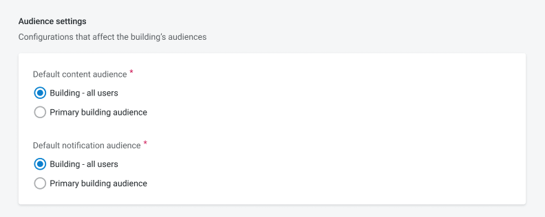 If you set the default audience for Content to Building - All Users Audience and the default audience for Notifications to Primary Building Users Audience, then: