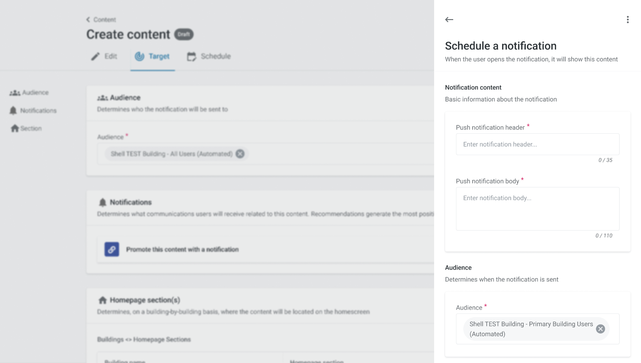 Setting the default audience for Content to be Building - All Users Audience while setting the default audience for Notifications to be either Primary Building Users Audience allows for the use case of all users being able to see the content but only users who have that building as their primary to receive the notification so it is sent to the most relevant audience.