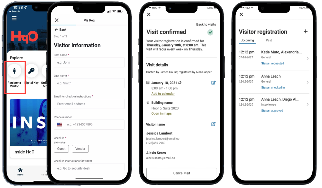 Register visitors by submitting visitor name, email and phone number.