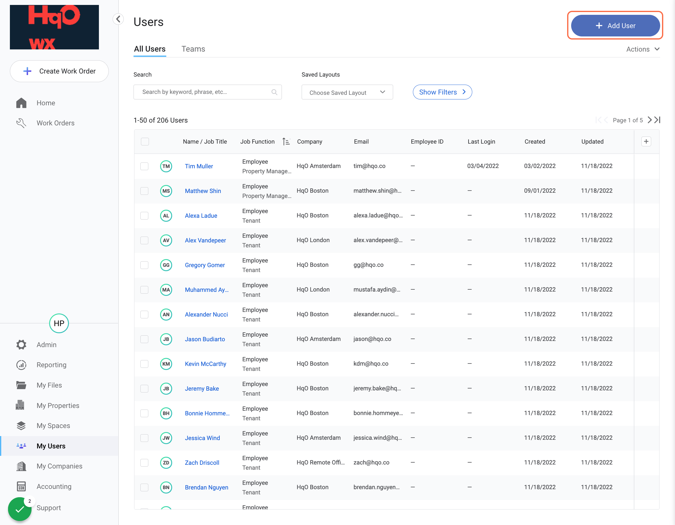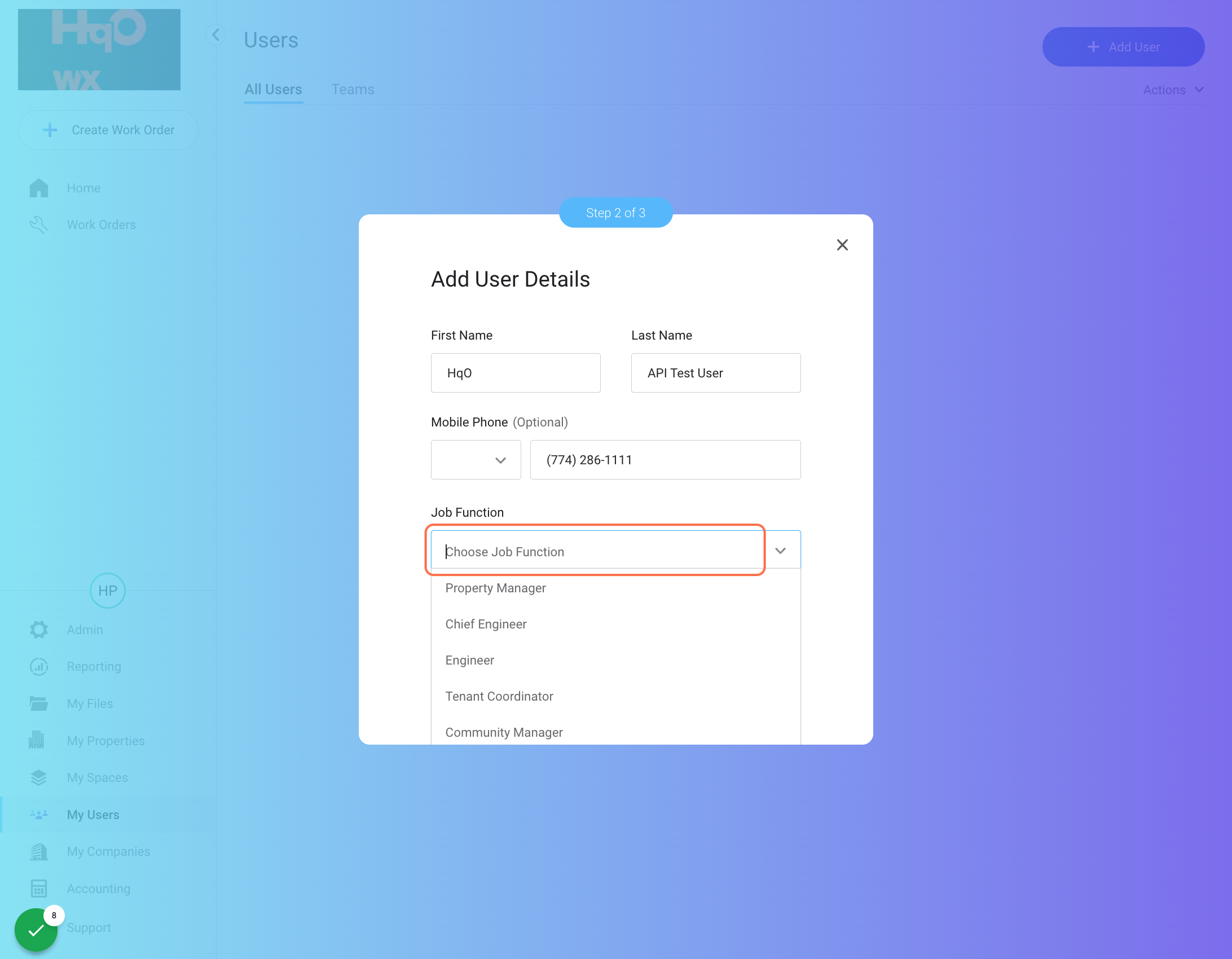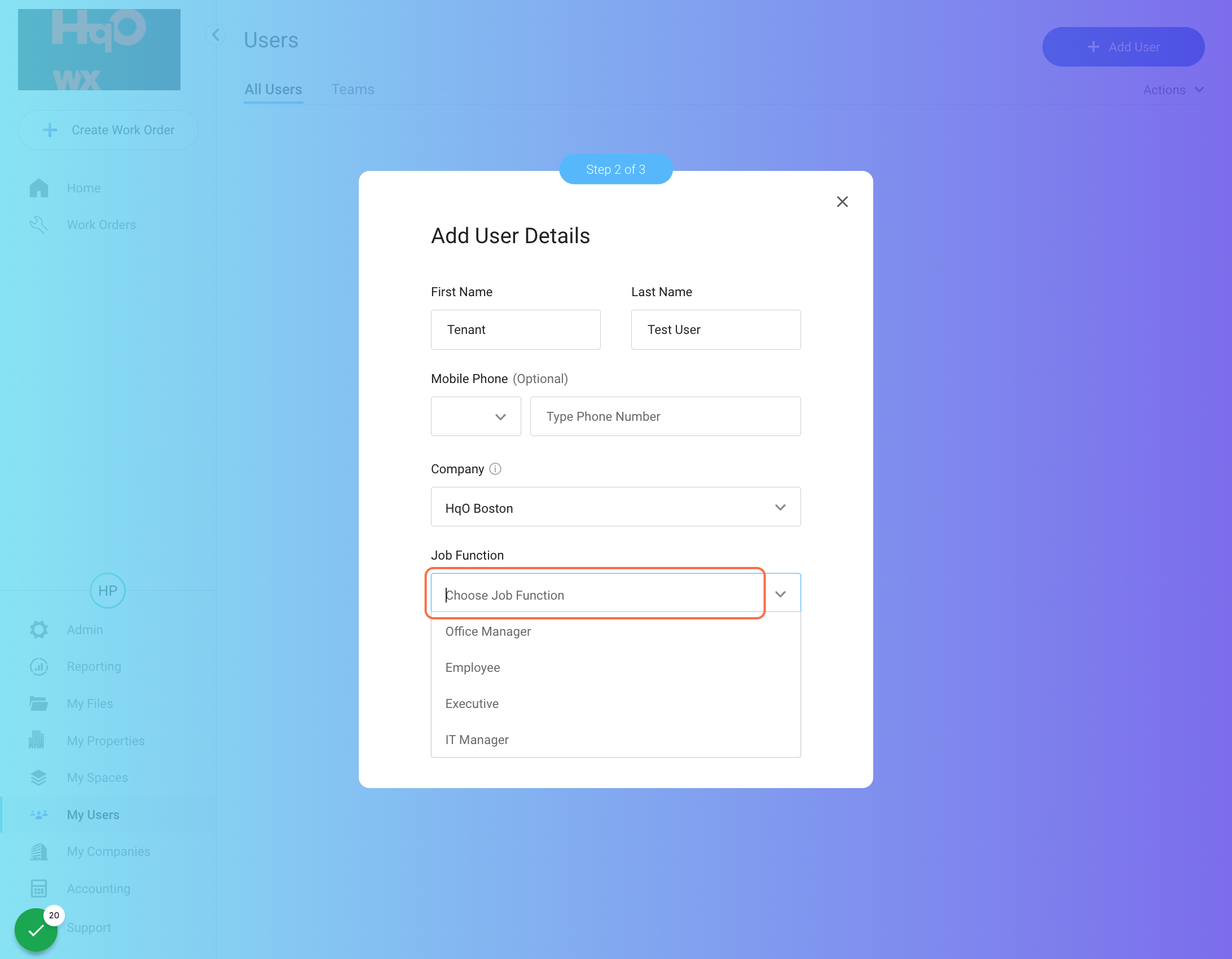 First & Last Name: For best practice, add “HqO Tenant” & “Test User” for First & Last Name