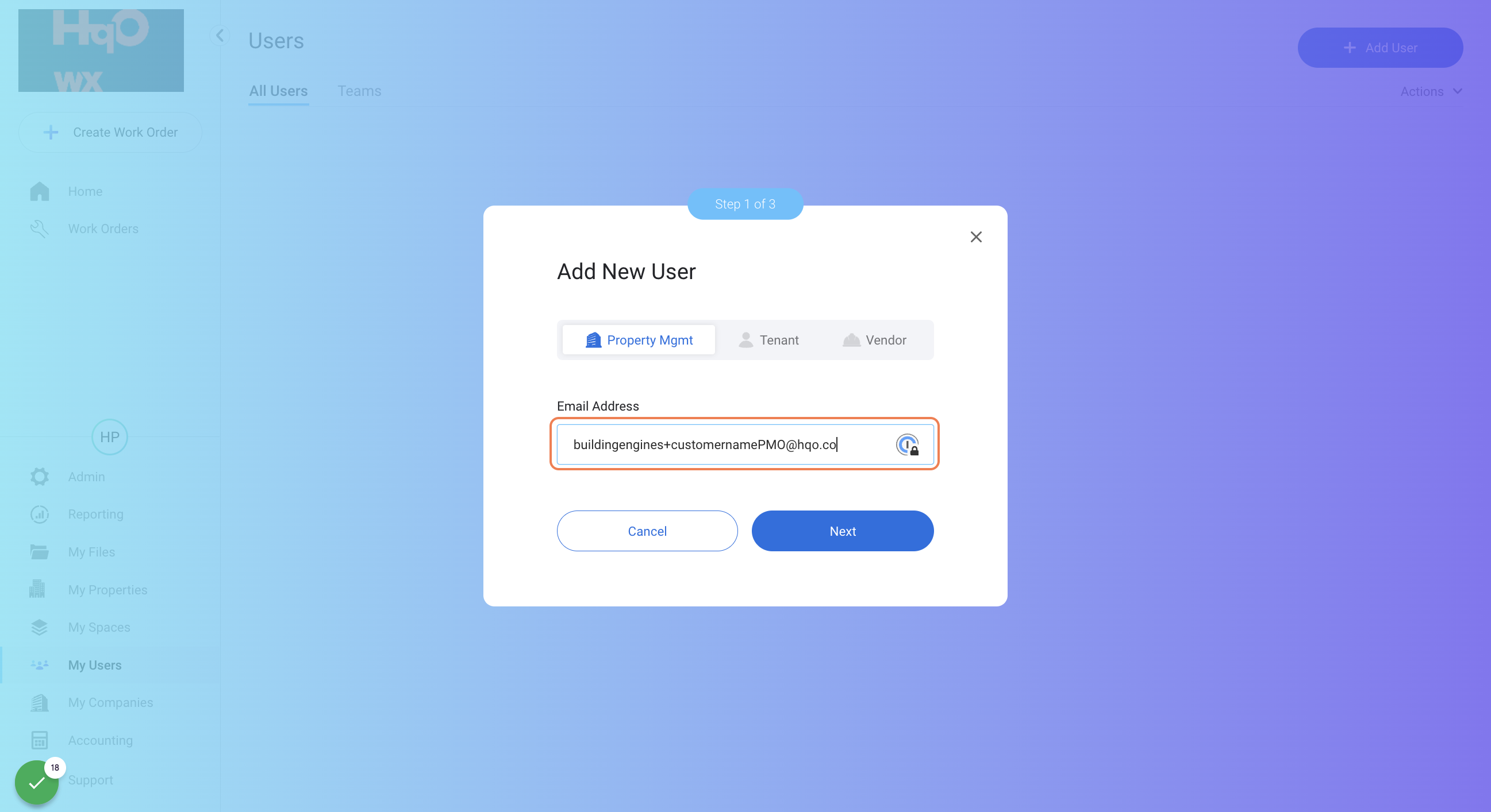 example: buildingengines+hqoPMO@hqo.co (replacing "HqO" with the customers name)