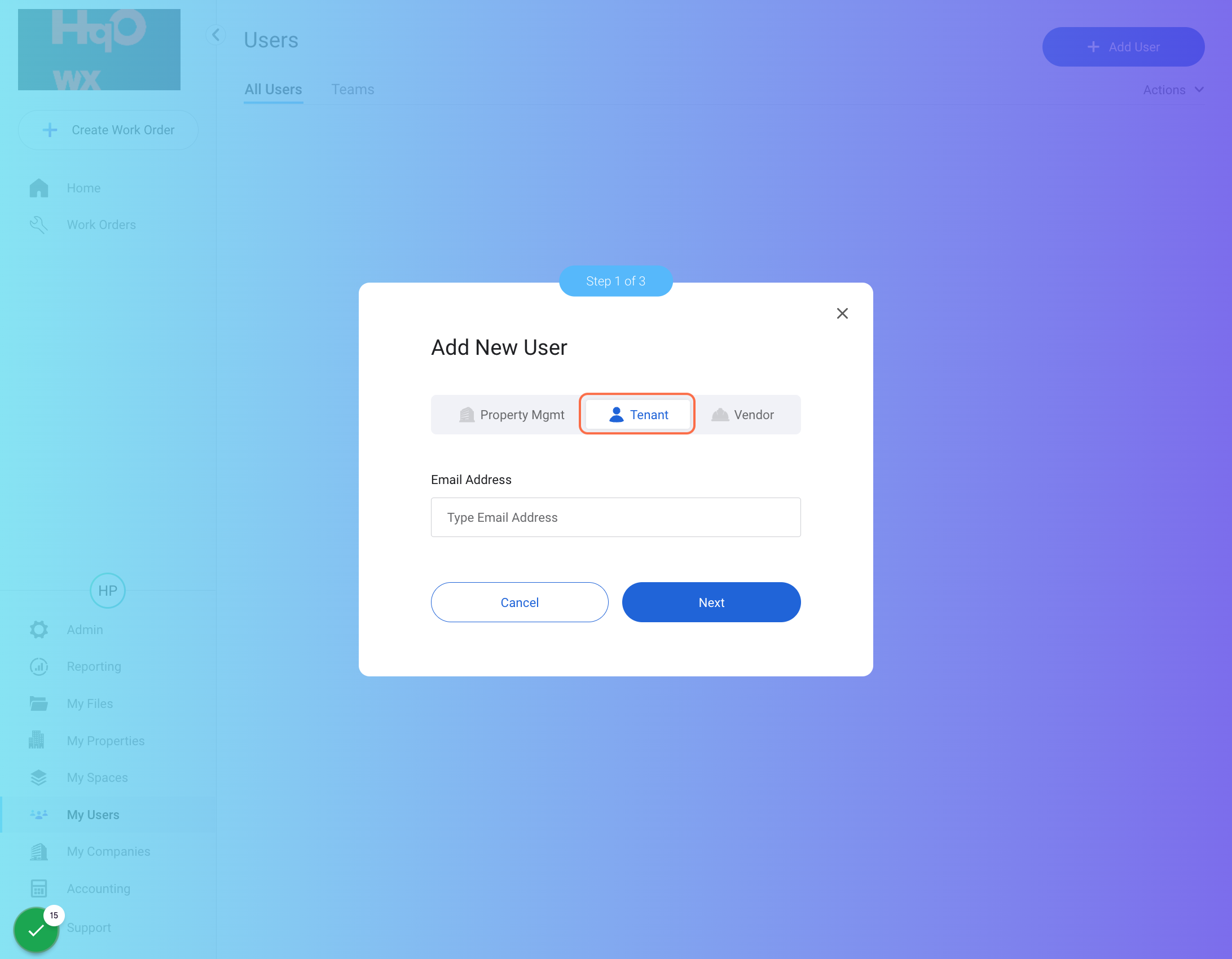 Make sure to toggle over to "Tenant", as this user should not be a Property Manager/Admin as the previous user you created.