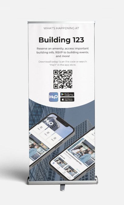 Customized, pre-assembled retractable banners can be placed in the lobby and other common areas. HqO will sponsor up to 2 banners per asset prior to launch.