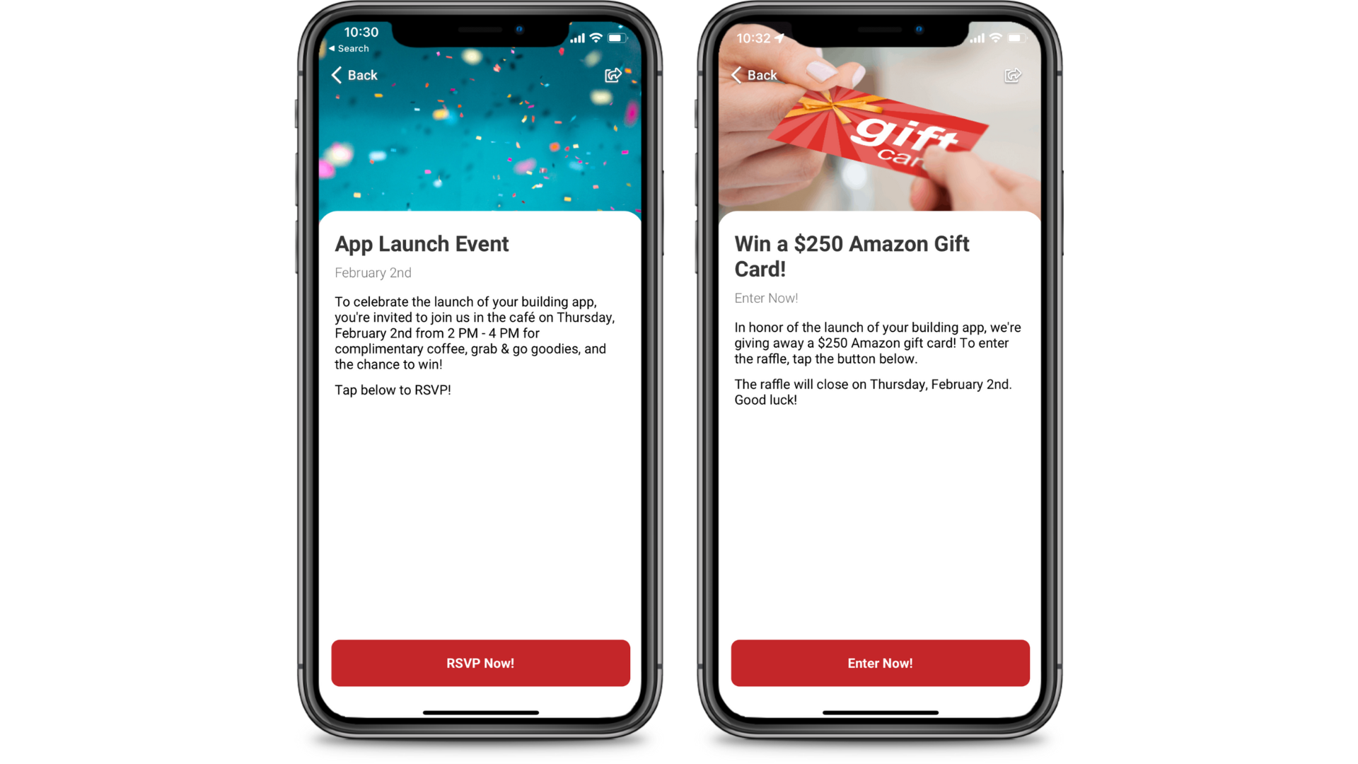 Once the app is live, you should schedule push notifications to promote the ongoing launch incentives and events. The first few weeks of launch are also a good opportunity to begin scheduling push notifications about building updates and information in order to emphasize the app’s ability to be used as a communication tool for tenants.