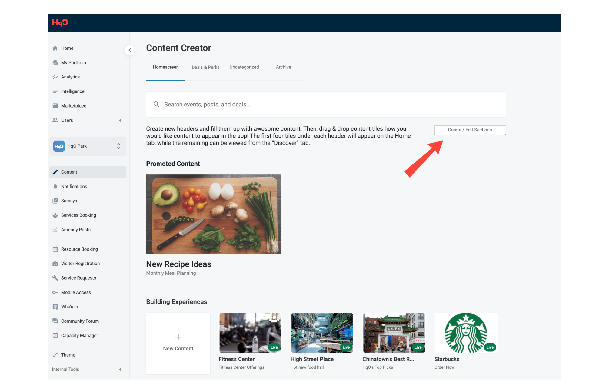 Step 2: Underneath the search field, navigate to the right-hand side of the Content Creator and click on the “Create / Edit Sections” button.
