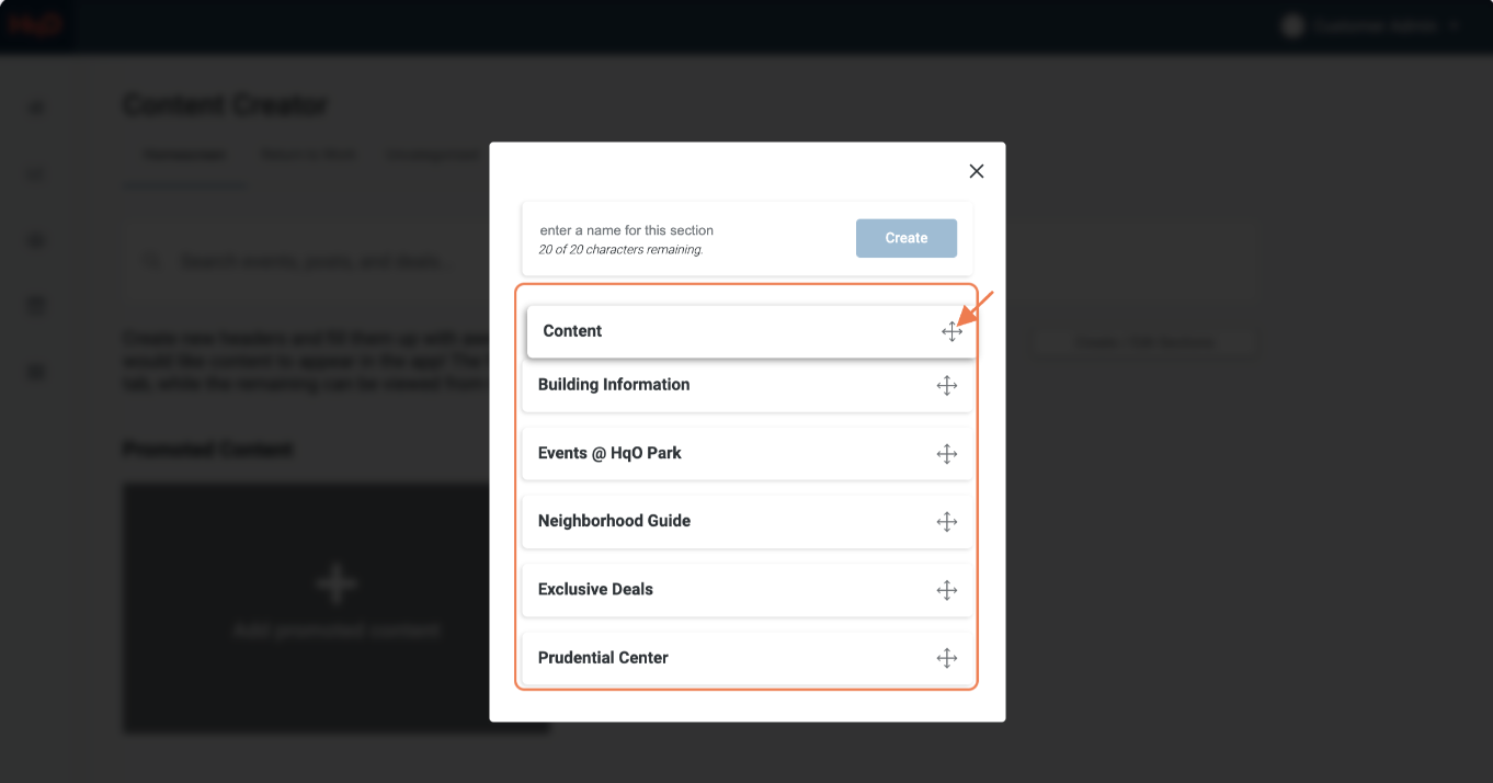 To move content on the home screen and spotlight tabs of HqO Admin simply drag and drop the content to reorder and drag and drop the tile in a new section. View the video below for reference: