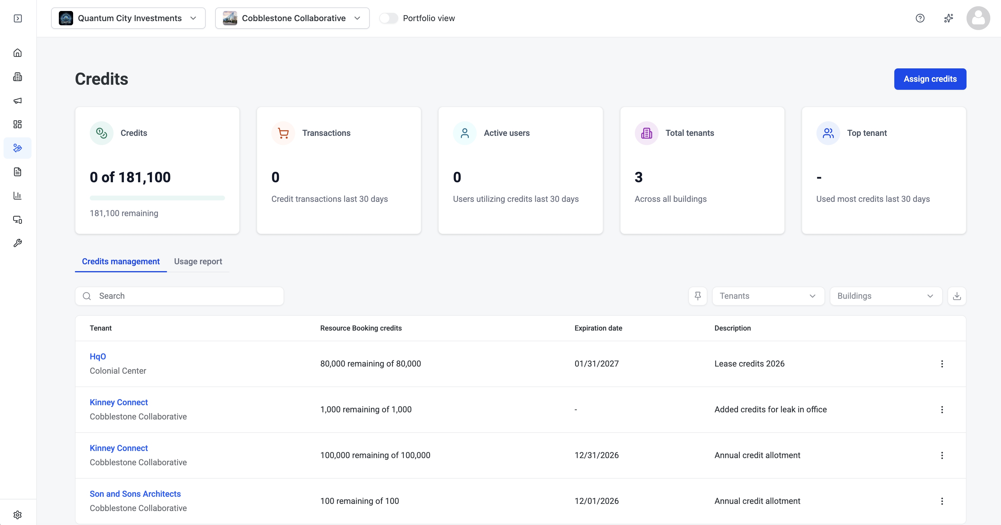 Credit management: View assigned credits, expiration dates, and descriptions. Filter by tenant or building, and export data.