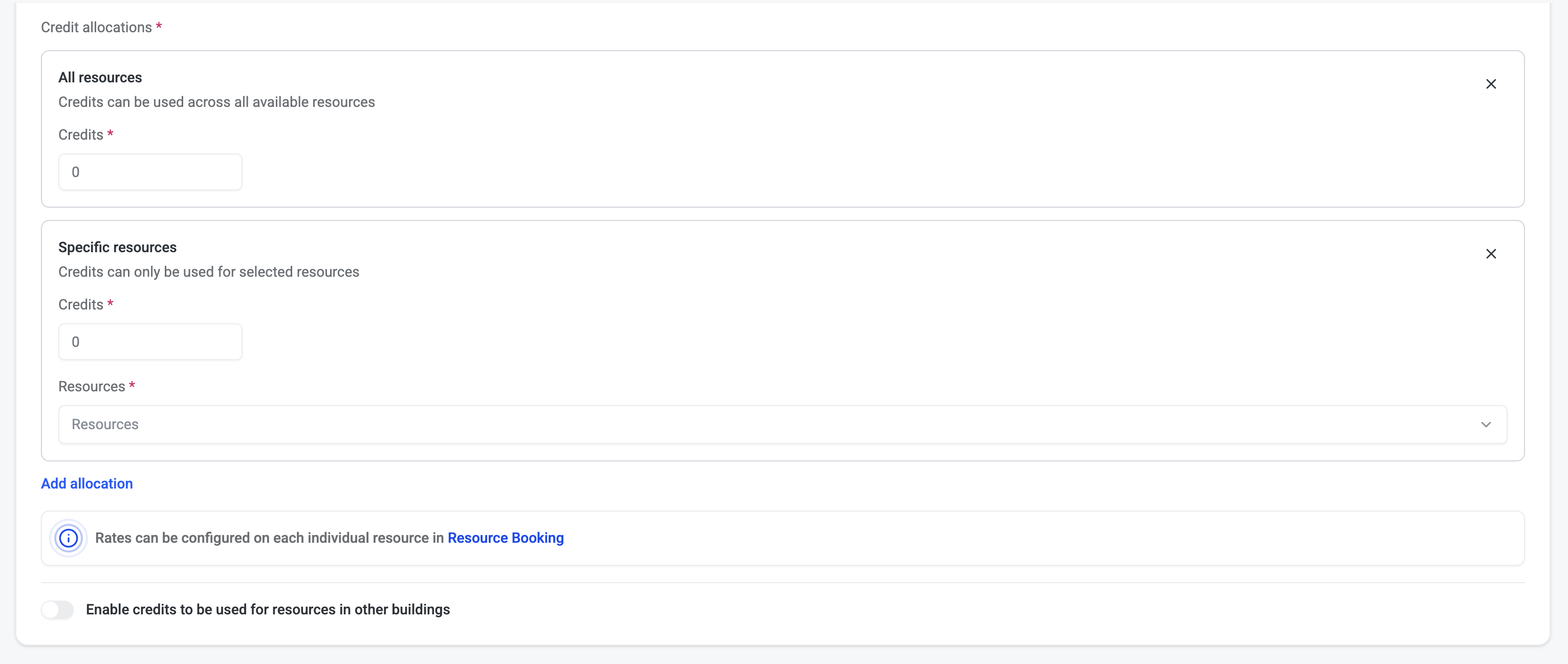 All resources: Set a credit amount that can be used across any bookable resource (e.g., 60,000 credits for all resources)