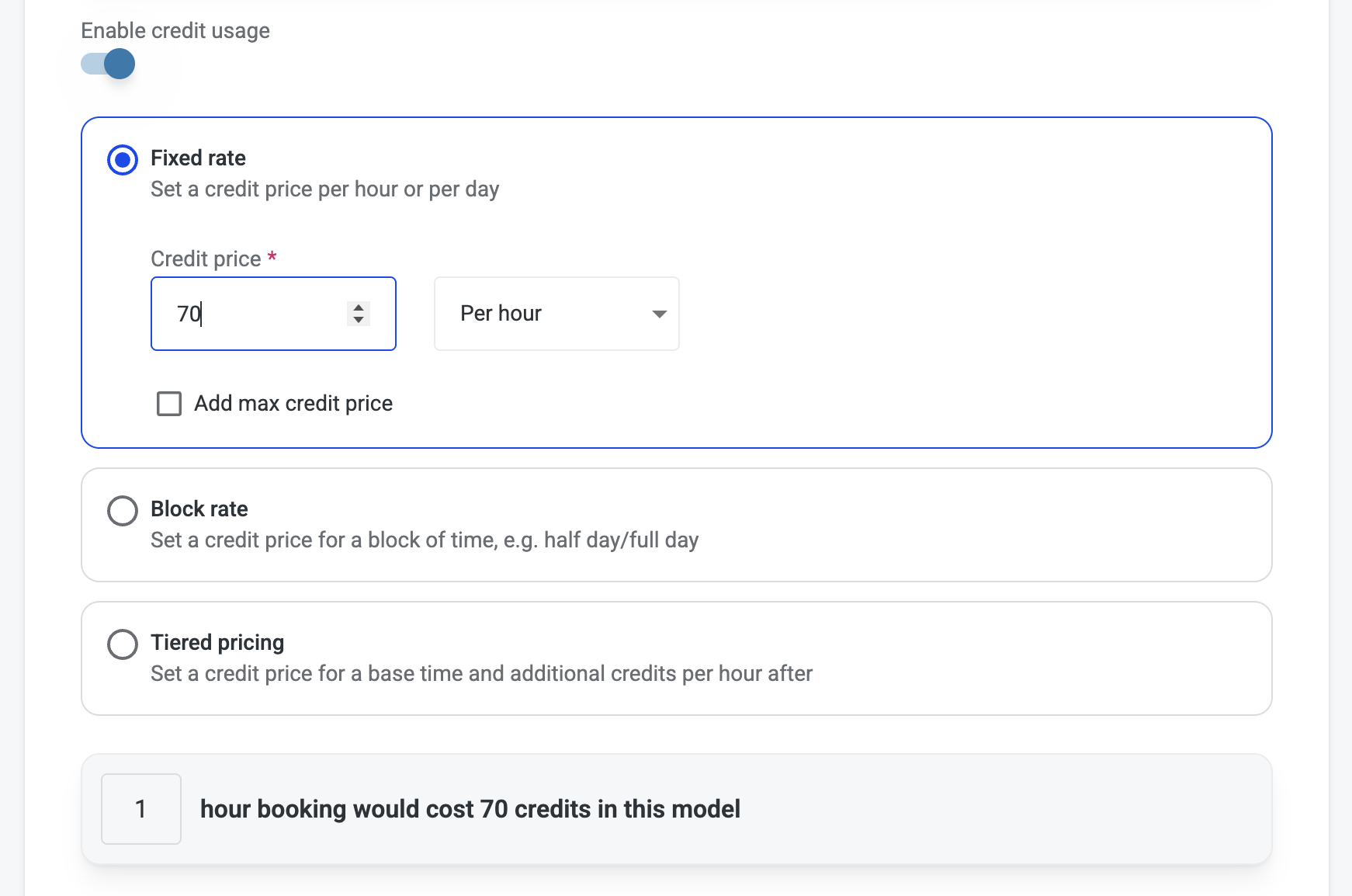 Max credit price: Optionally set a maximum credit charge for a booking. For example, if the max is 300 credits, a full-day booking would cap at 300 credits regardless of hourly rate.