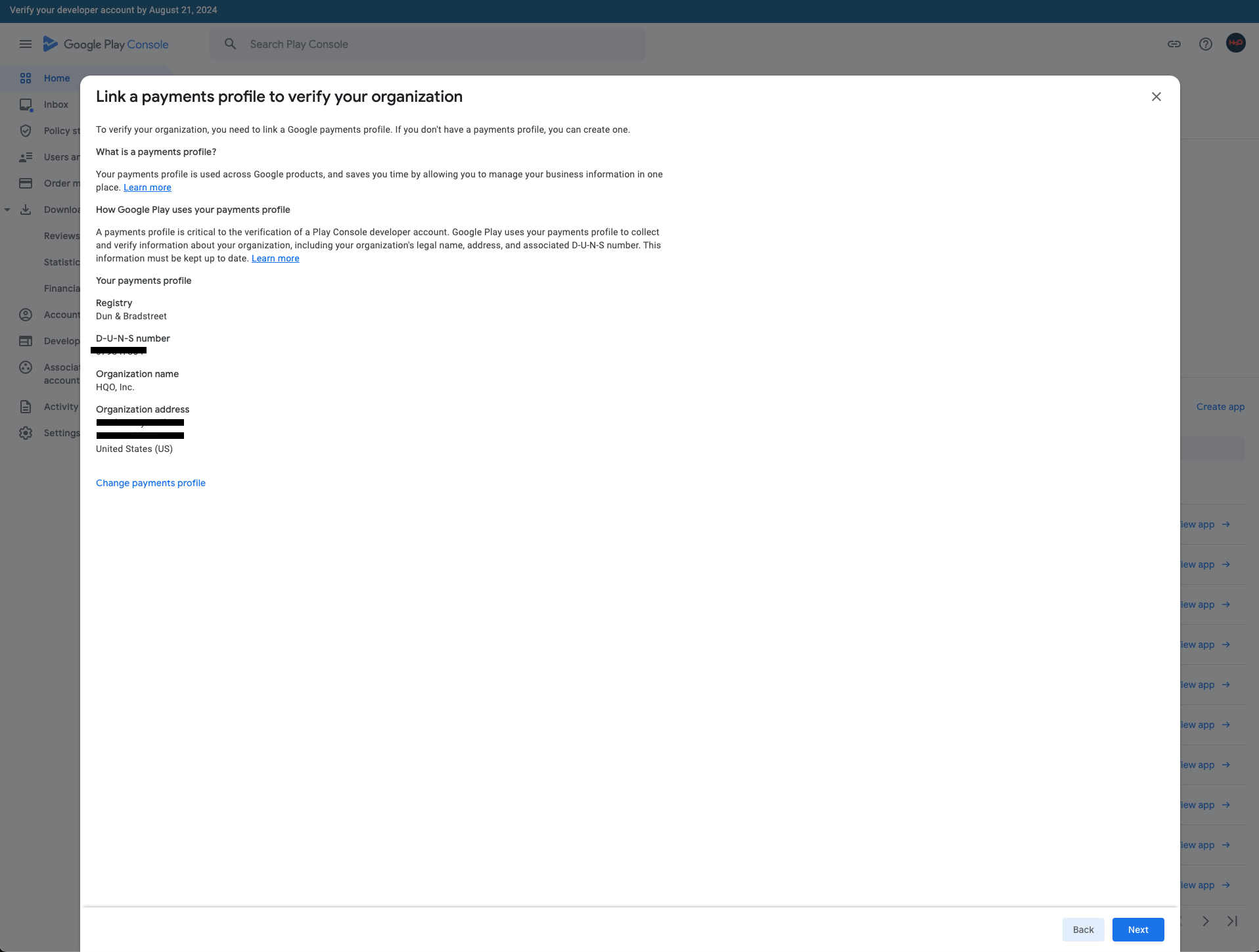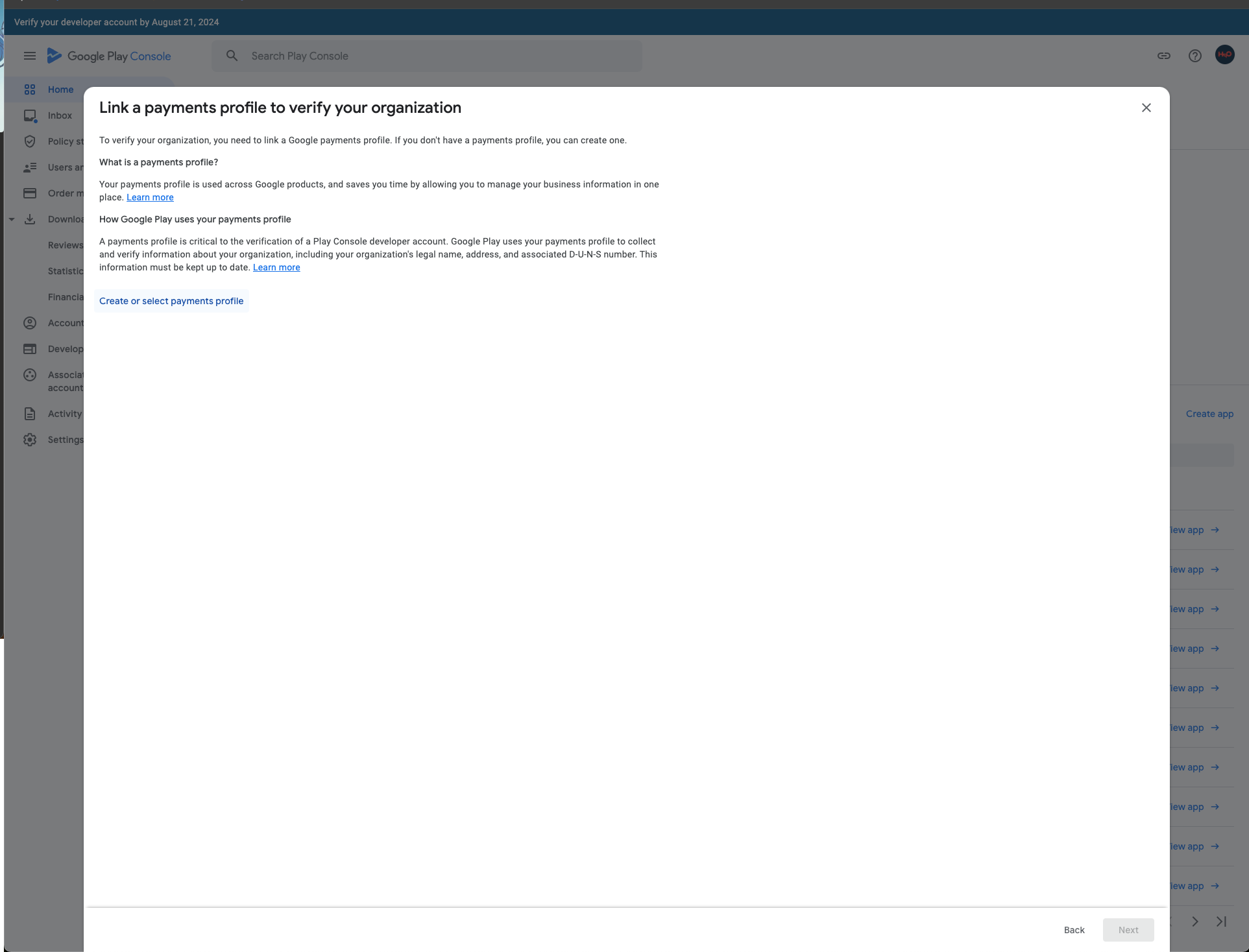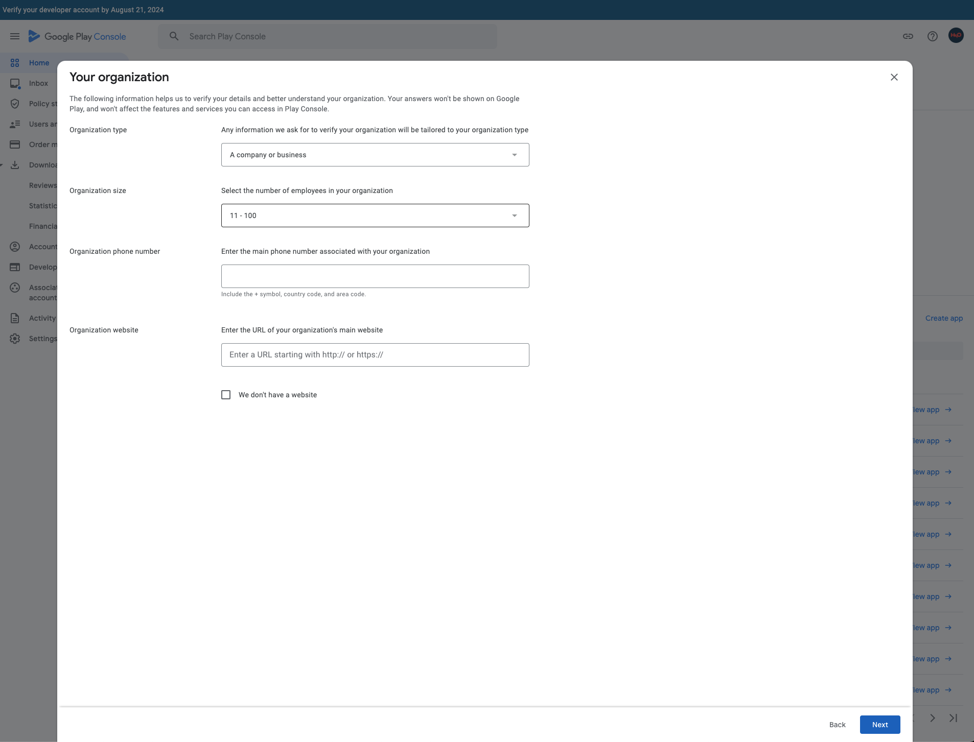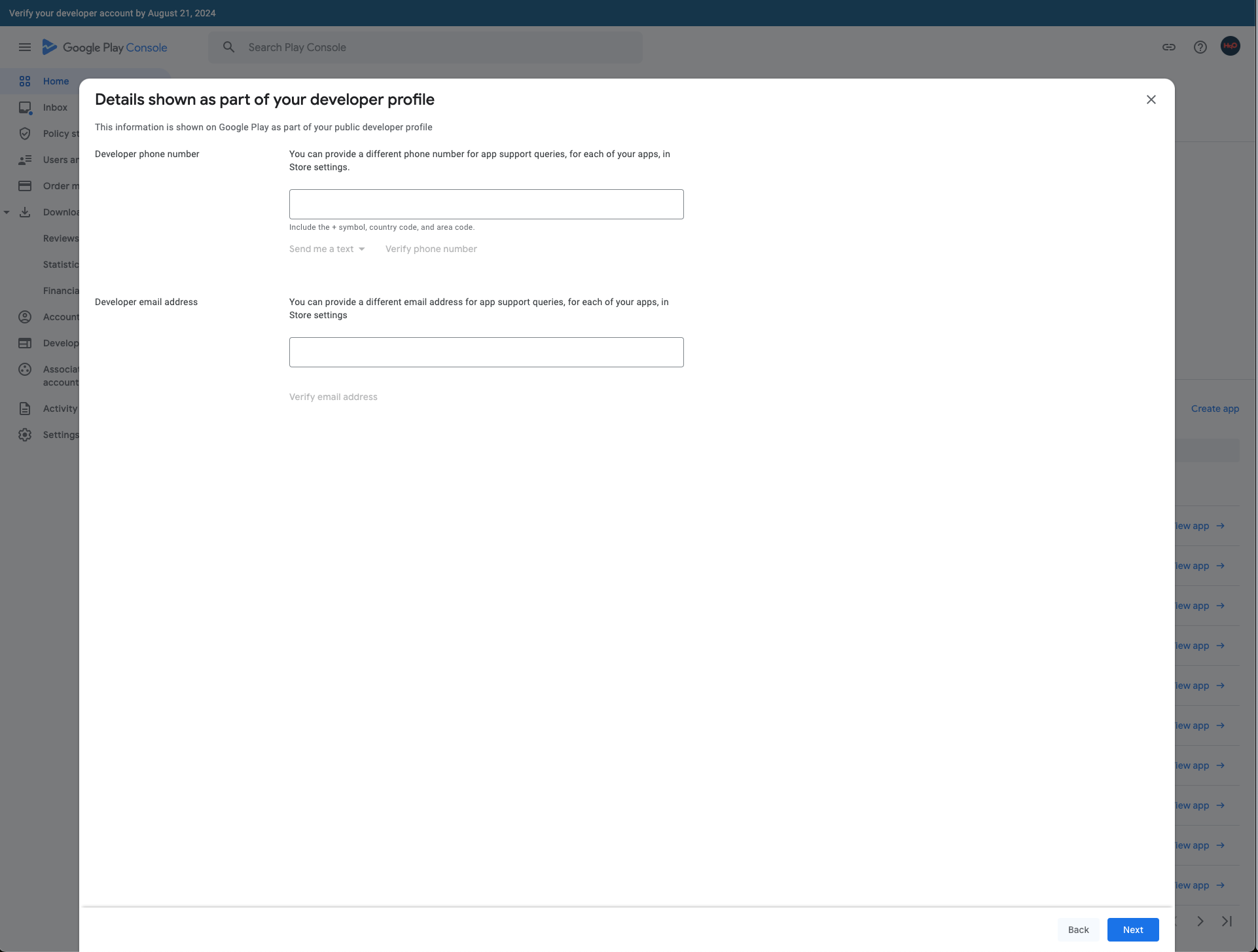 Enter details regarding the developer profile, this will be displayed on Google Play. Click “Next” when ready.