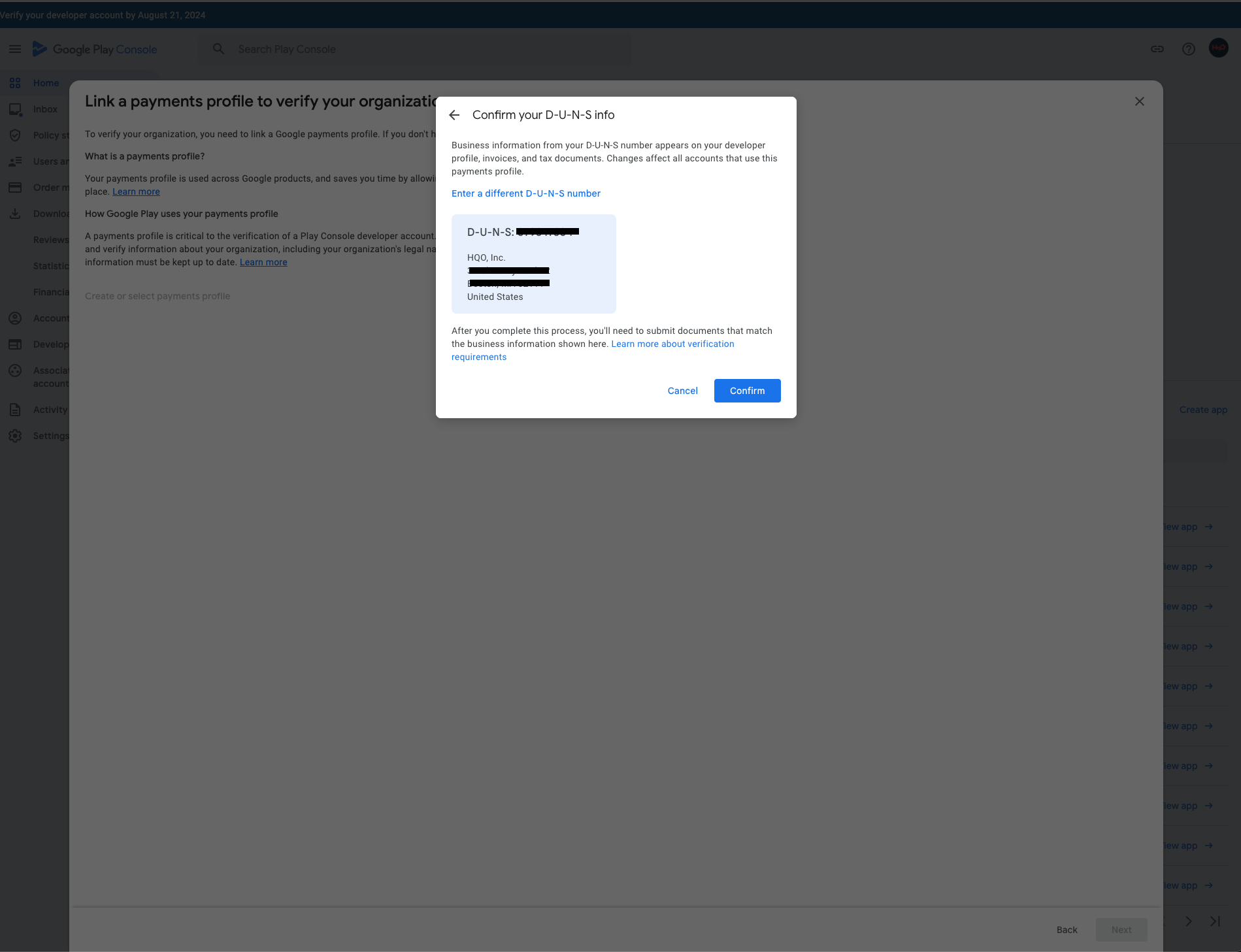 Confirm your D-U-N-S number and info and click “Confirm” to continue