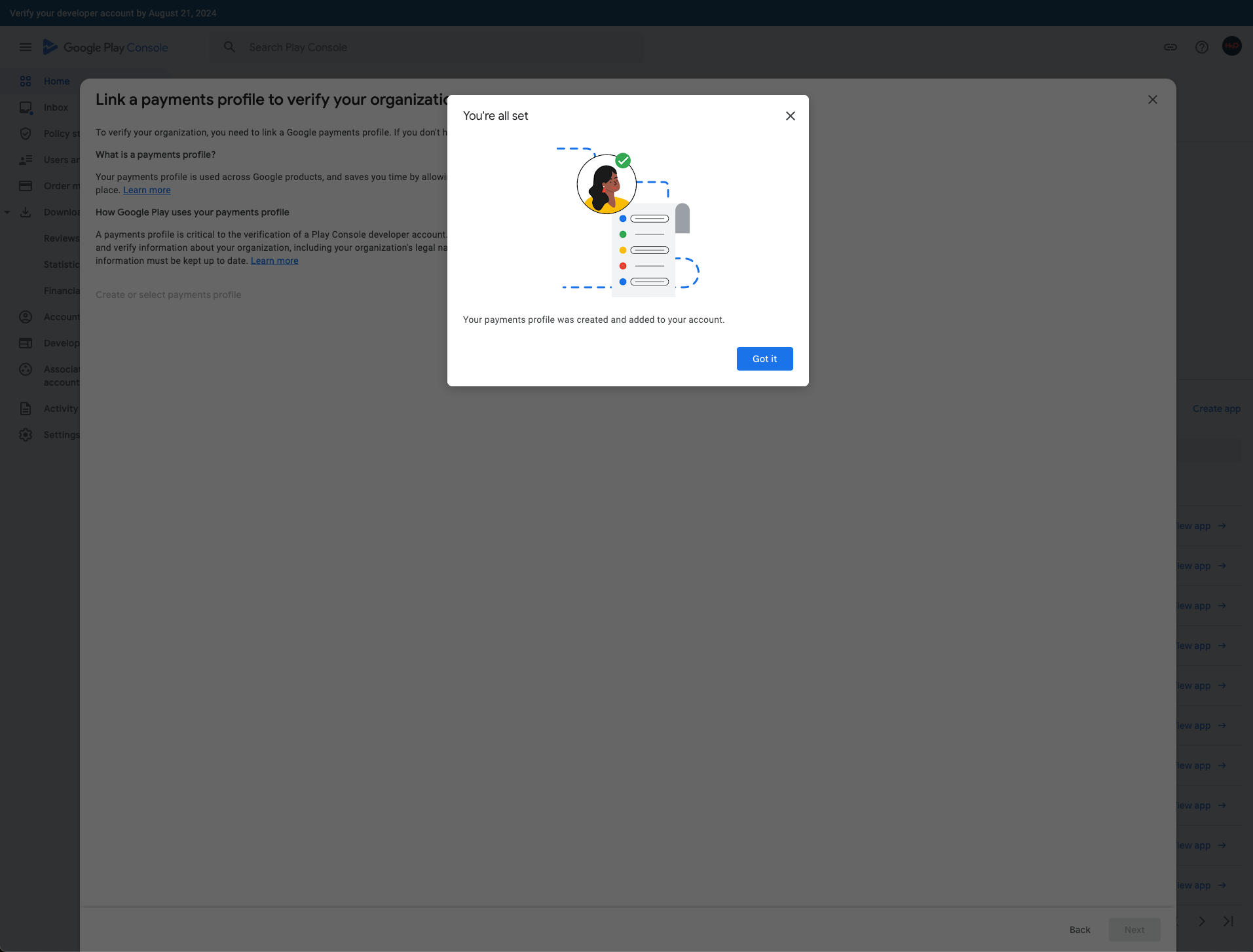 You will have created a payment profile if one didn’t exist before. Click “Got it” to continue