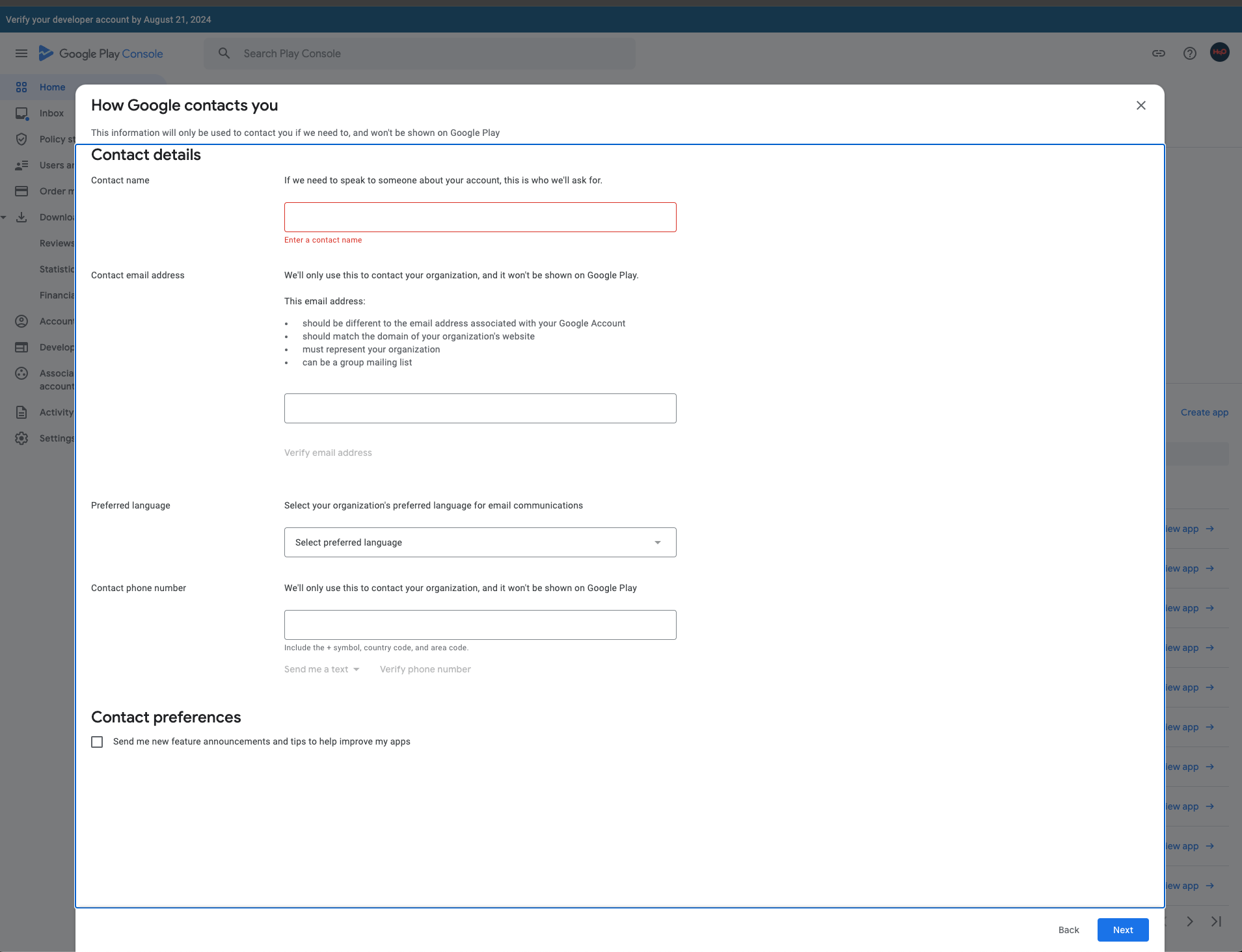 Enter details to contact you if Google needs to verify any information. This information will not be shown on Google Play