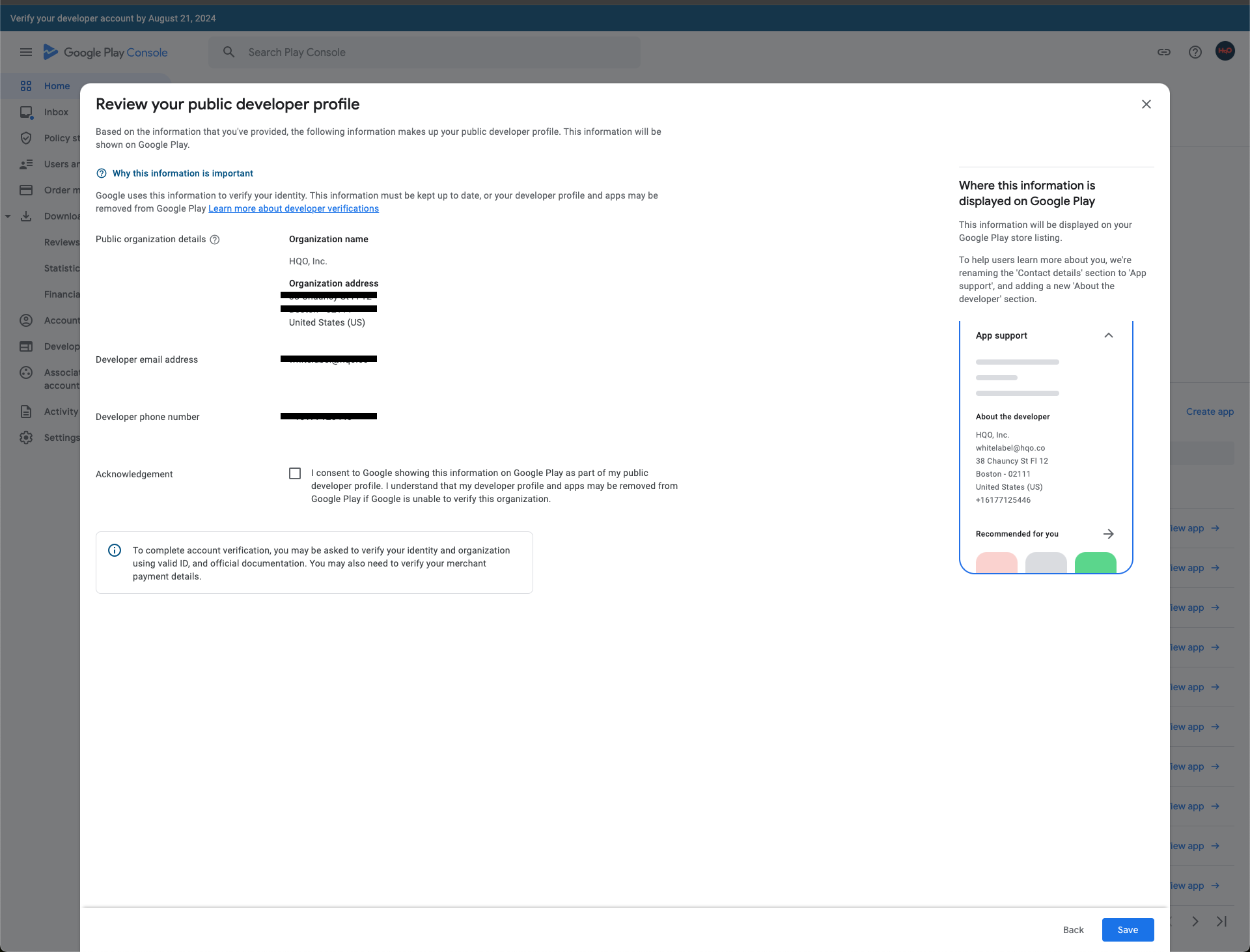 Review your public developer profile details and check the “Acknowledgement” box. Allowing consent for Google to show organization contact info on the Google Play page. Click “Save” if everything looks correct.