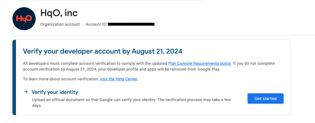 Log into the Google Play Console for your developer account. If you are within a month of the verification due date you should have access to the “Get started” button to start the process. Click the “Get started” button to continue