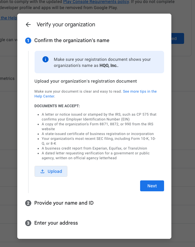 Follow the steps outlined and upload a document to verify your organization followed by a document to verify yourself