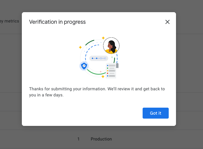 Once all done you’ll get this final pop up that the verification process is in progress. Keep an eye out via your email and potentially via the contact number you submitted in case Google decides to reach out. Within a few days you should get an update on the verification process and if it was completed or if Google needs any additional information from you.