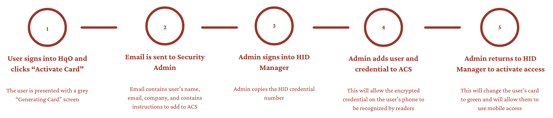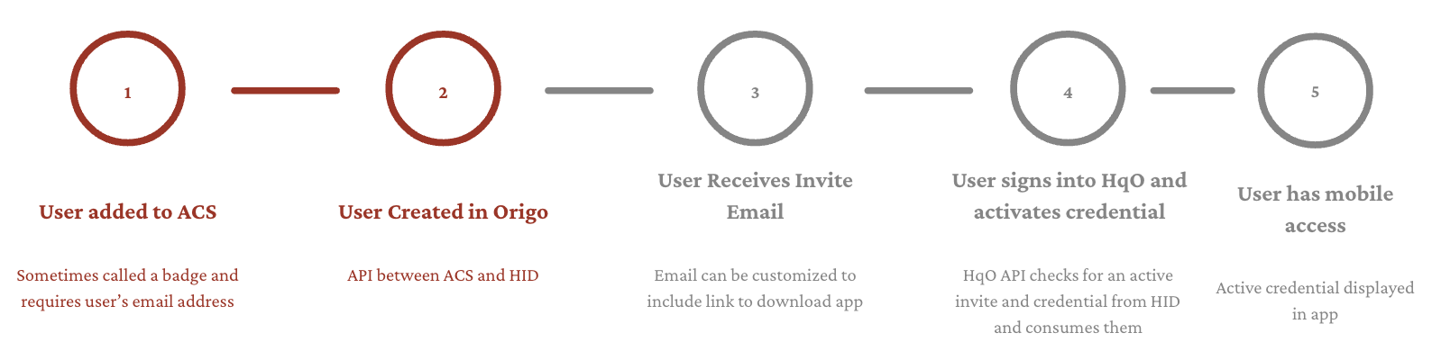 No ACS integration? No problem! We can still deliver mobile access with HID by giving your security team access to HID Manager in HqO Admin, where they can pull HID credentials and manually add to their Access Control System without having to log into Origo. See the ACS-Initiated v. User-Initiated Onboarding section below for more details.