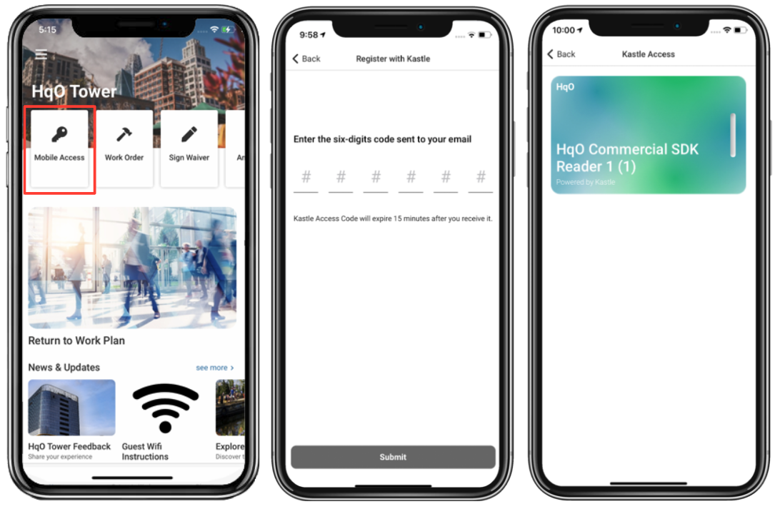 HqO & Kastle will collaborate to set up the app integration. Once complete, you can help by coordinating on-site testing of Kastle mobile access within your HqO app.