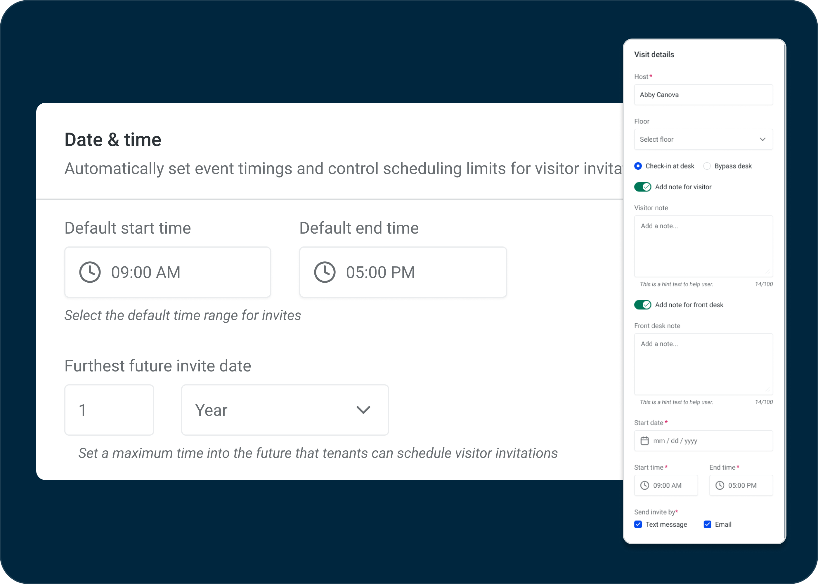 The Advanced Visitor Invitation Settings provides landlords with enhanced control over tenant visitor management allowing them to determine both the default duration for visitor invites and the maximum time into the future tenants are allowed to schedule visitor invitations. These settings ensure secure visitor scheduling, aligning with building business hours and operational policies.