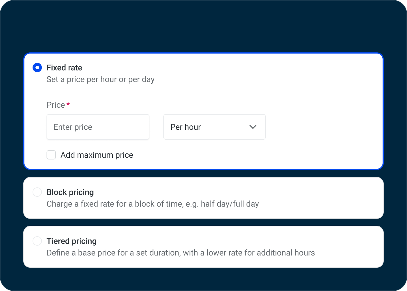 Maximize demand and optimize resource usage with flexible pricing options for bookings. Property teams can now set fixed rates (a set price per hour or per day), block pricing for half-day and full-day reservations, or tiered pricing, which allows a base price for a set duration with a lower rate for additional hours. With clear price breakdowns before checkout, tenants gain full transparency, making it easier to choose the option that best fits their needs. Empowers property teams to implement smarter pricing strategies while improving space utilization and tenant satisfaction.