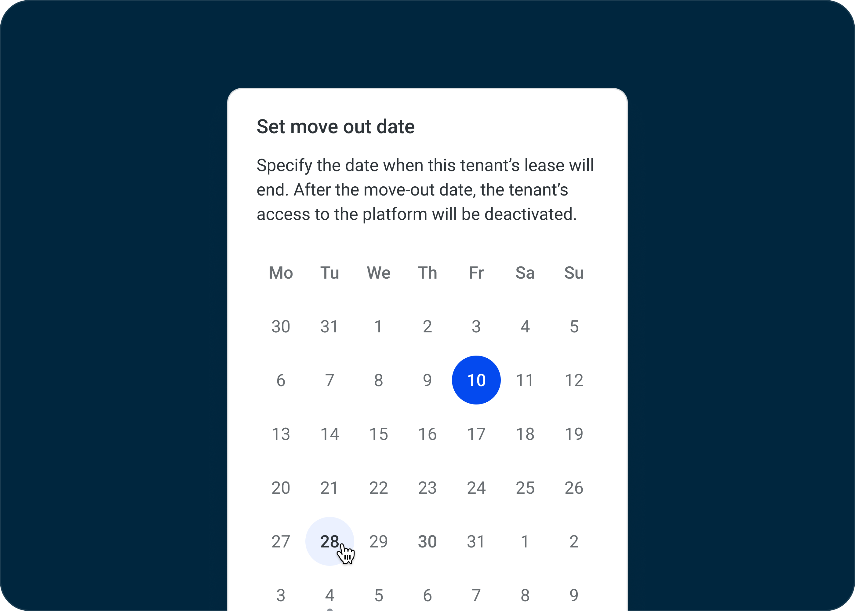 The Tenant Offboarding enables property teams to efficiently offboard tenants when they vacate a building. By empowering landlords to manage this core process directly within the platform, it ensures that the right users have access and tenant data is properly archived or transferred.