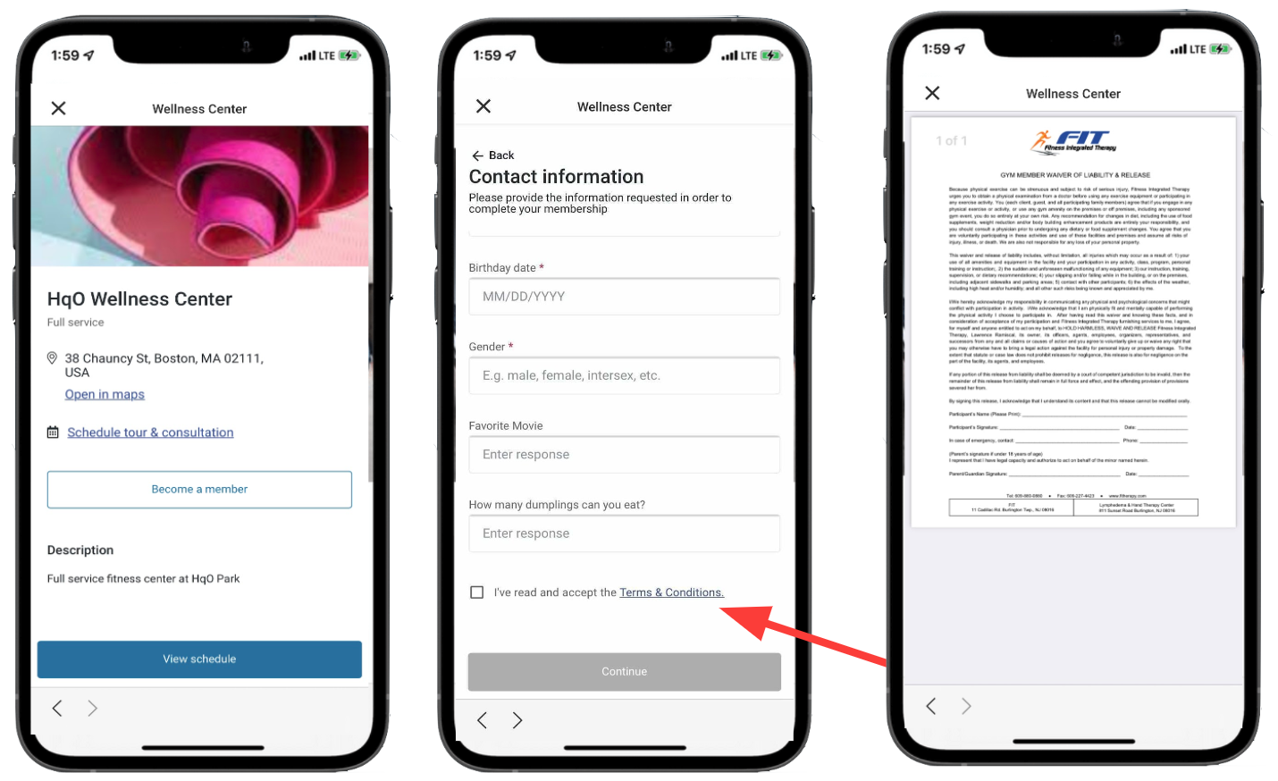 Your fitness center team has the ability to add their waiver to a contract, and users must type their name at the end of the purchasing flow to “sign” the waiver. This would be configured within Mindbody and not HqO Admin.
