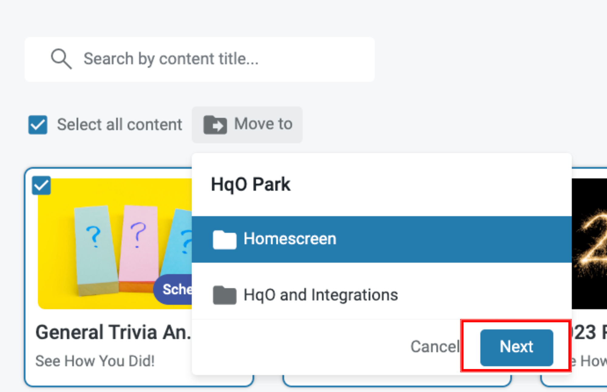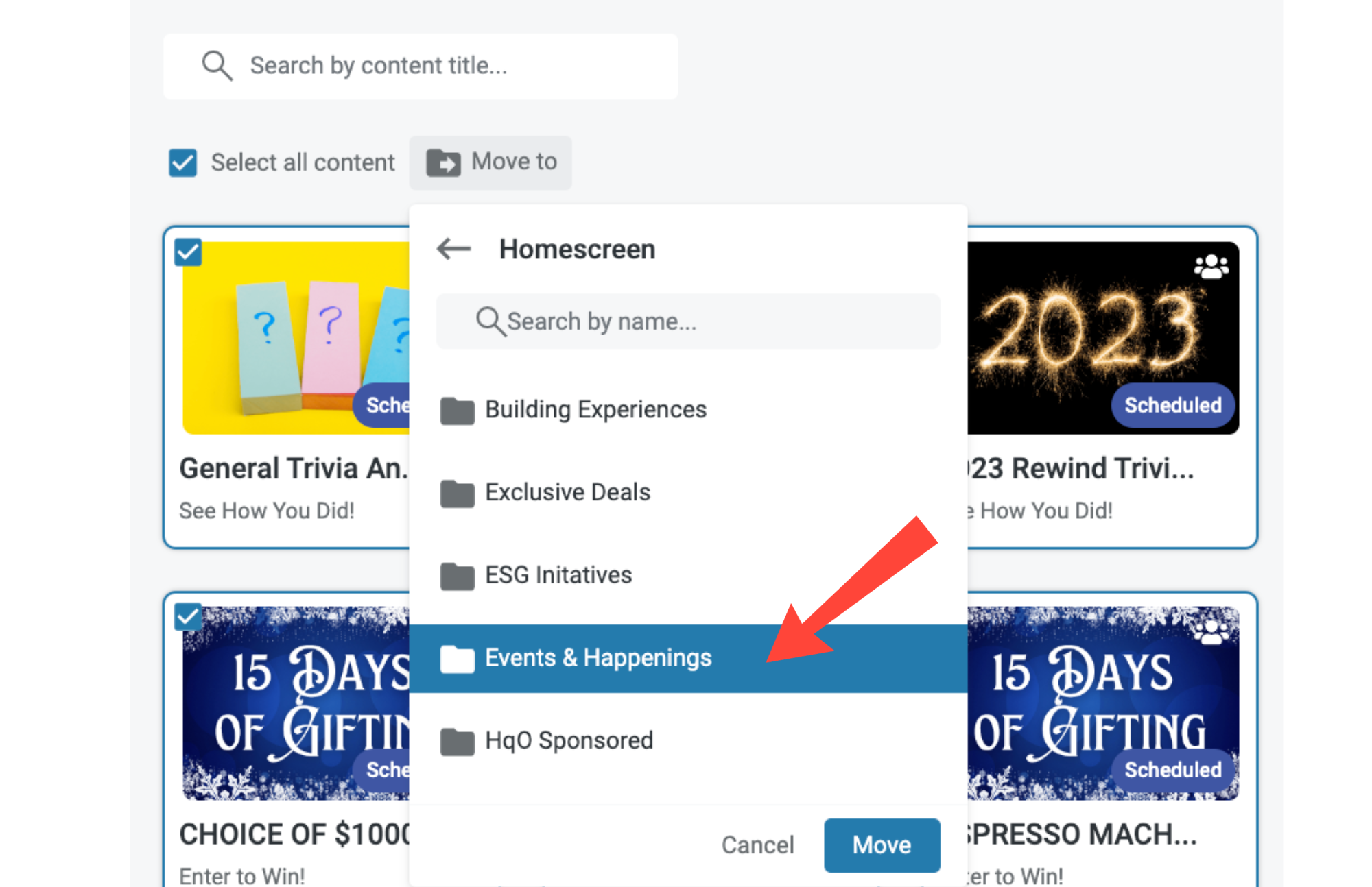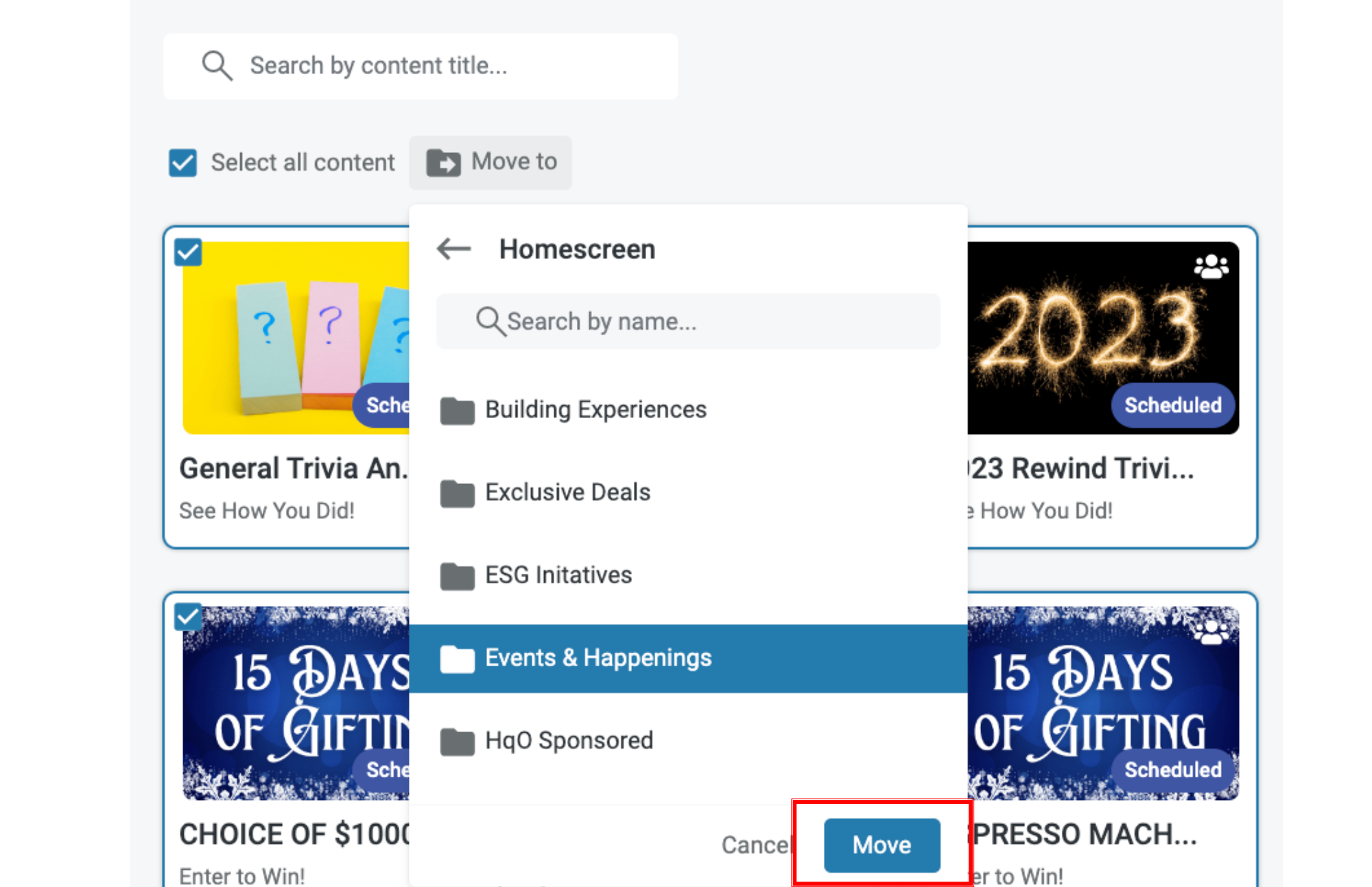 Multiple Pieces of Content Selection: Select the pieces of content you’d like to move by clicking on the checkbox on the top left-hand corner of all pieces of content.