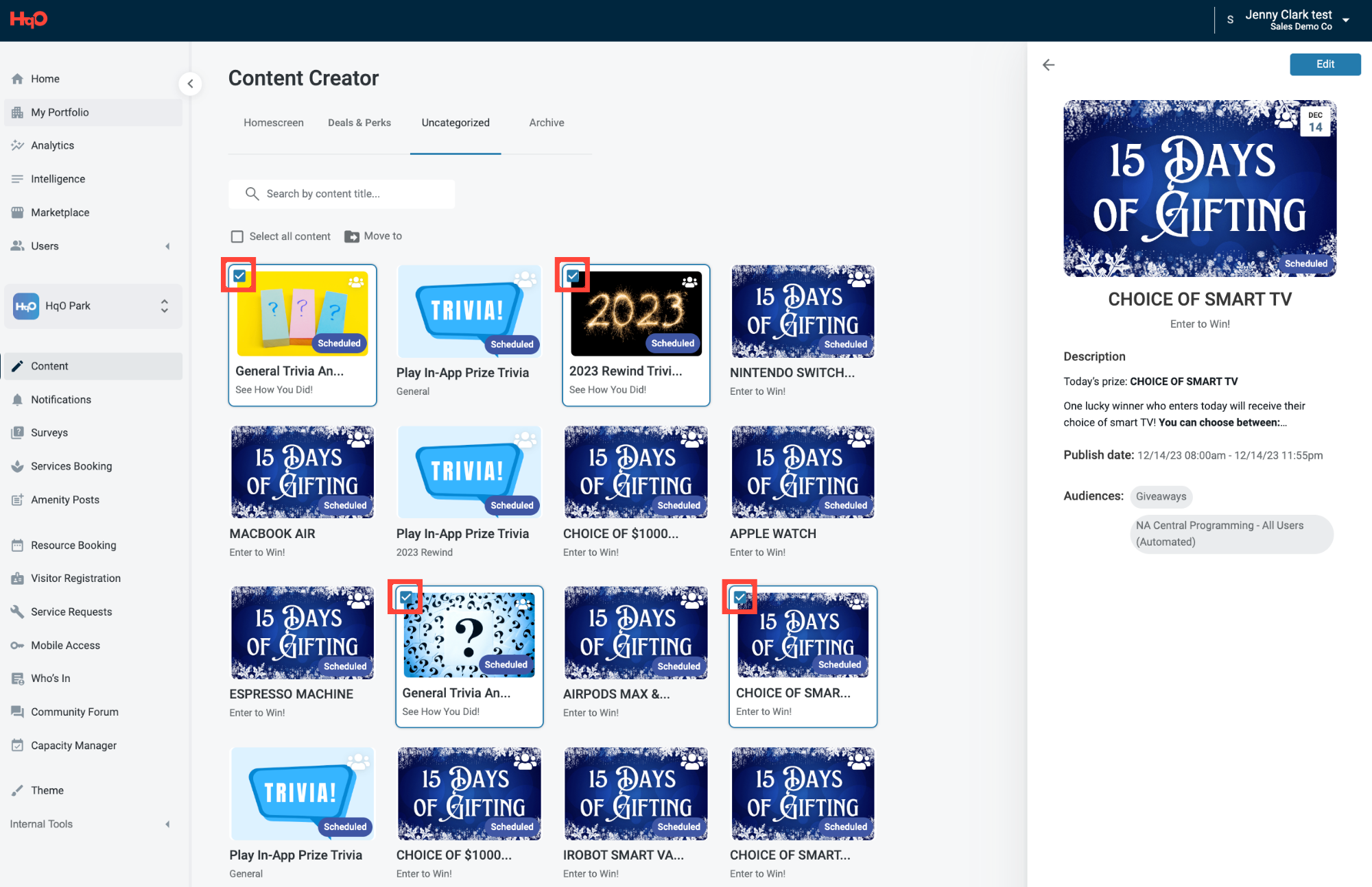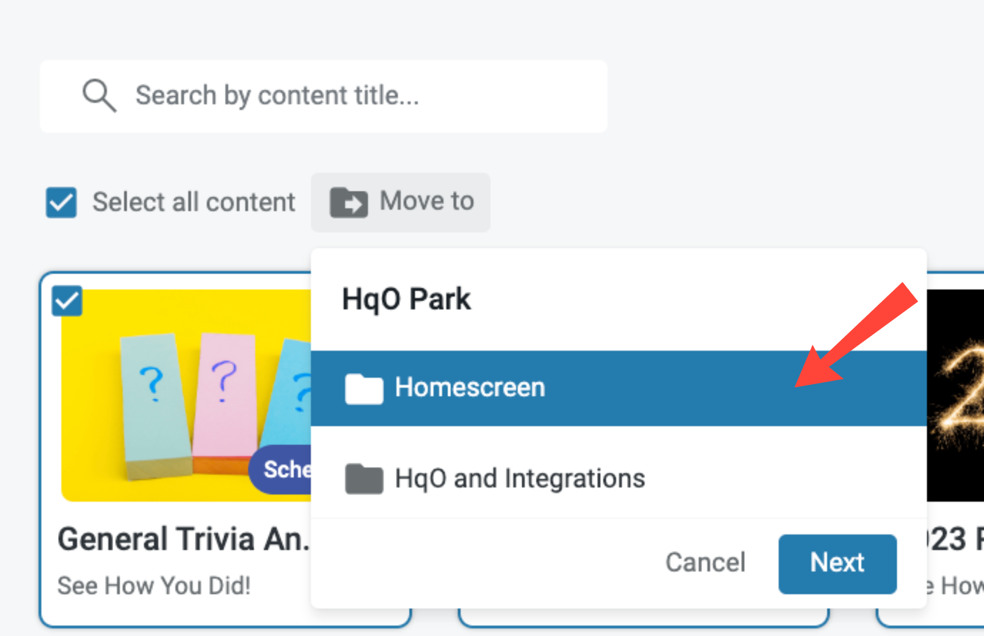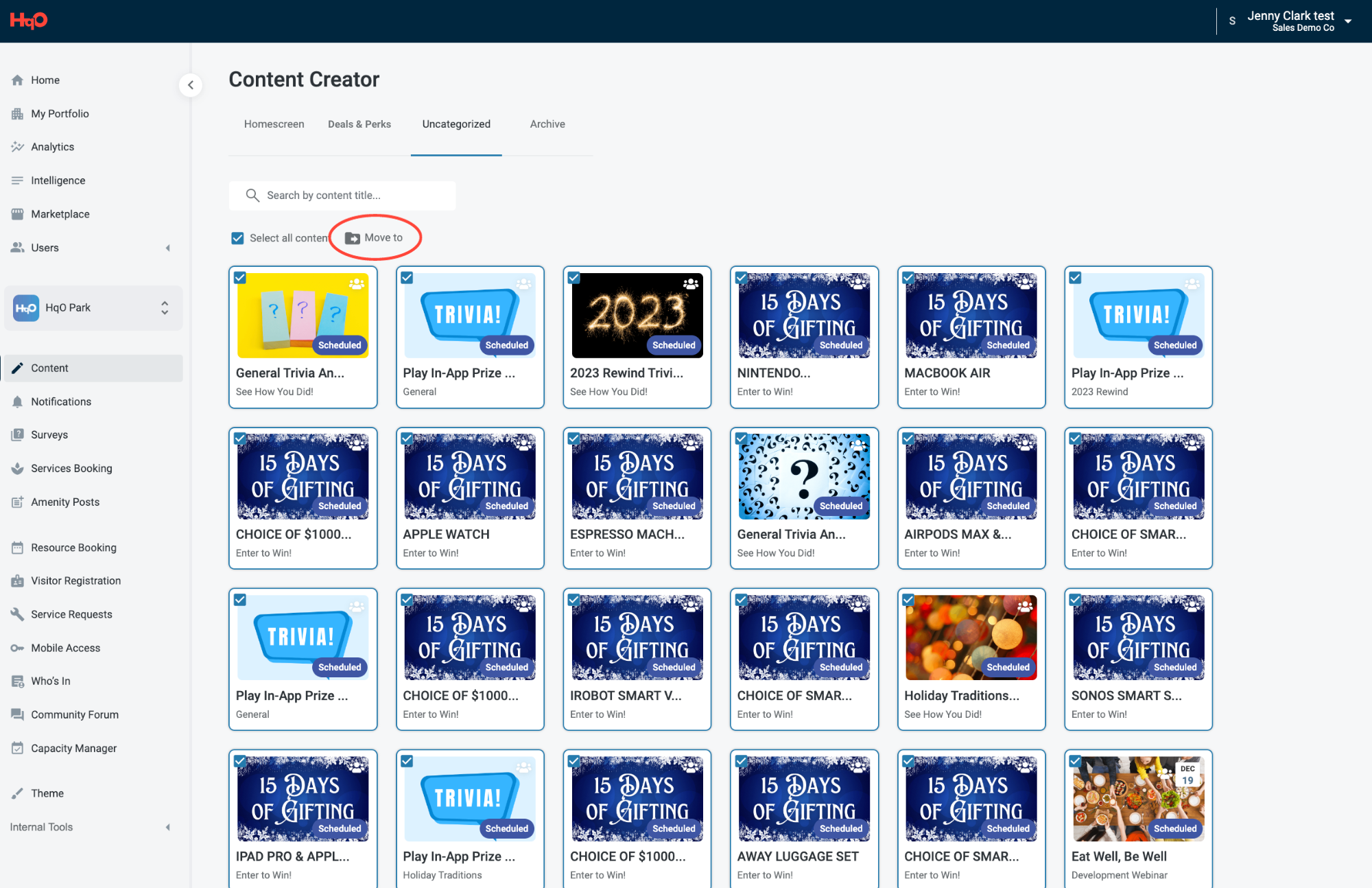 Multiple Pieces of Content Selection: Select the pieces of content you’d like to move by clicking on the checkbox on the top left-hand corner of all pieces of content.