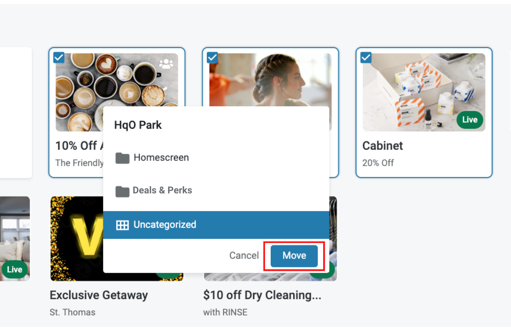 Step 5: Once you click “Move to,” a second dropdown will populate that will prompt you to move your content to the homescreen (“Homescreen”), the spotlight tab (“Deals & Perks”), or the Explore section (“Explore”). Select “Explore”.