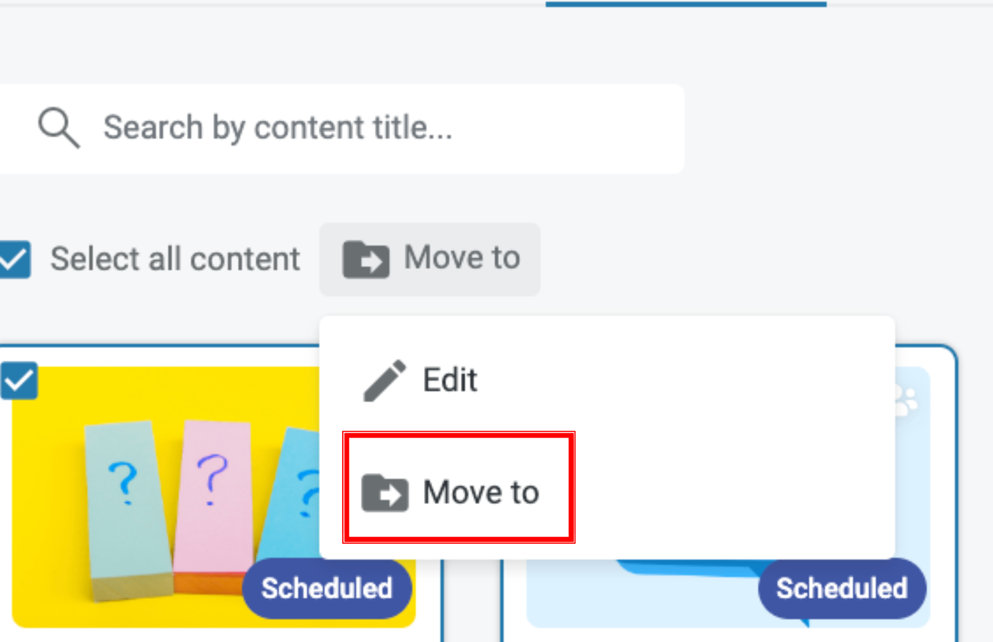 Single Piece of Content Selection: Select the piece of content you’d like to move by clicking on the checkbox on the top left-hand corner of the piece of content.