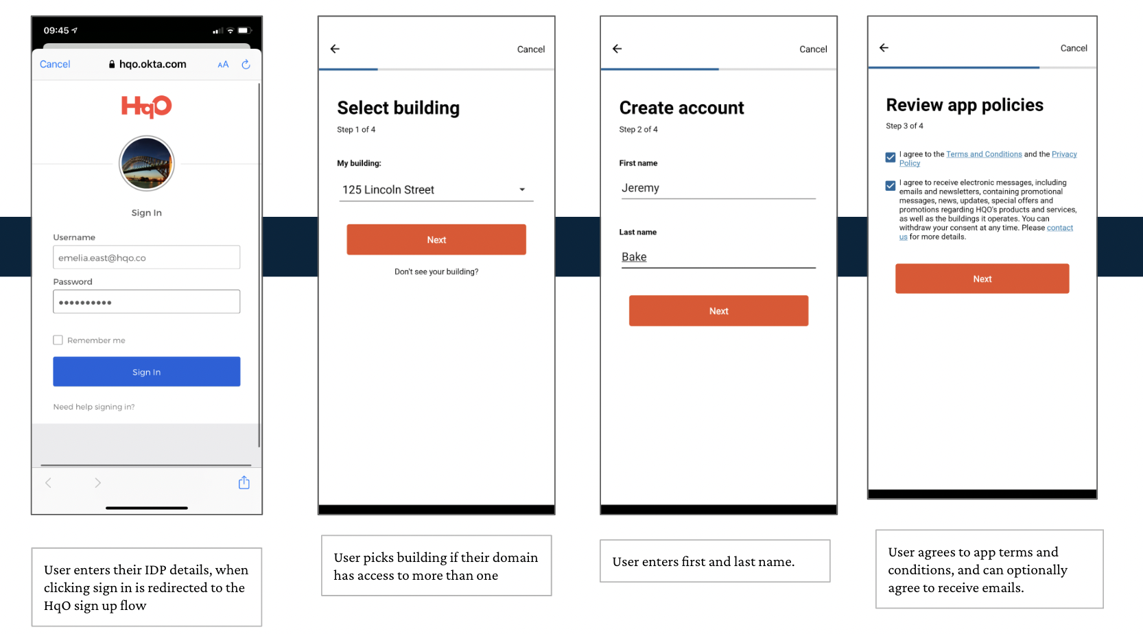 SSO also shifts responsibility for user management to the occupiers, which enables SSO from HqO. These companies have control to add and remove access to their employees through their Identity Provider (IdP).