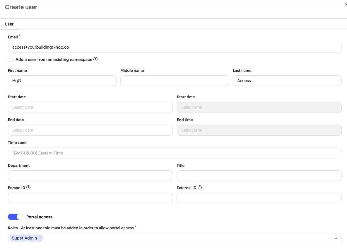 The HqO admin user created in your Openpath portal needs to be shared with the Openpath portal that will participate in zone sharing. Send the email address, permissions, and namespace (sharing the namespace is critical, as this is what allows our API to communicate with both the original Openpath portal and the new portal).