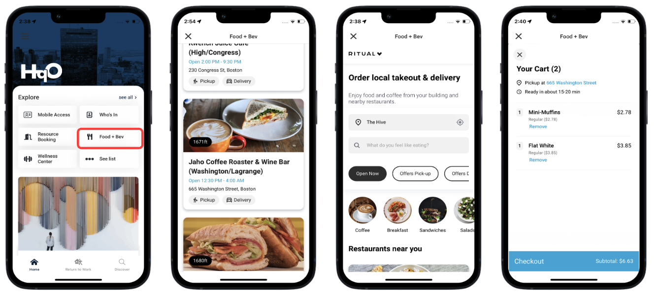 Integrating Ritual to your HqO app allows you to provide a seamless food & beverage experience from restaurants available via Ritual. You can also discuss adding your in-building restaurant or coffee shop to Ritual.