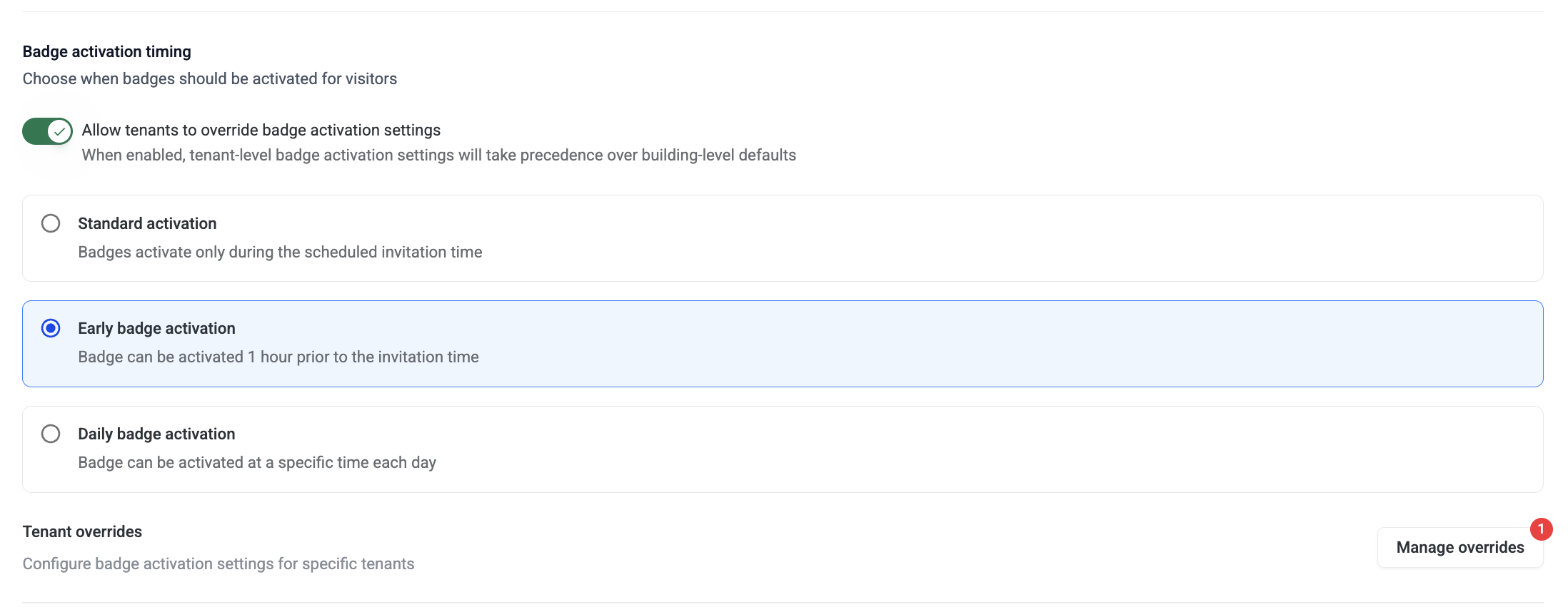 Badge Activation can be overridden per tenant. Buildings with mixed security profiles can set up tenant overrides so each tenant gets the right timing for their needs. When enabled, tenant-level badge activation settings will take precedence over building-level defaults.