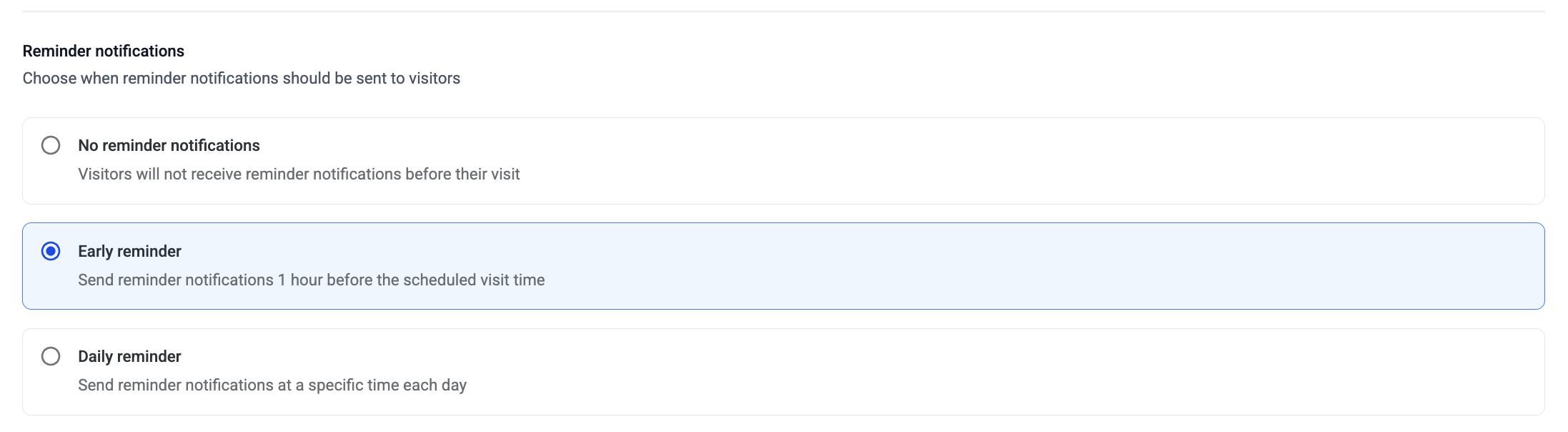 Early reminder — Send reminder notifications 1 hour before the scheduled visit time. Use for standard office buildings where visitors are external and may need a prompt.