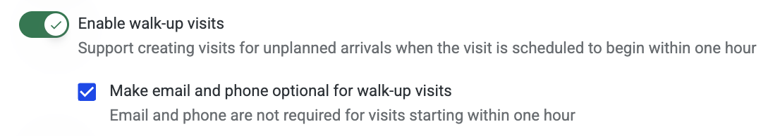 Make email and phone optional for walk-up visits When this sub-setting is enabled, email and phone are not required for visits starting within one hour. Full contact fields are still required for future-dated visits.