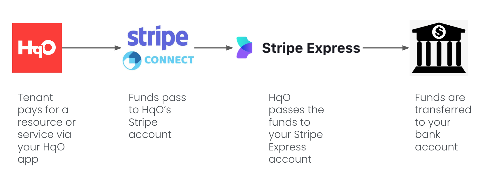 HqO uses Stripe to process payments from tenants and to pass funds to our customers. When a tenant pays for a resource or service through the HqO app, payments are processed through HqO’s Stripe account. HqO then passes the funds to you through your Stripe Express account.