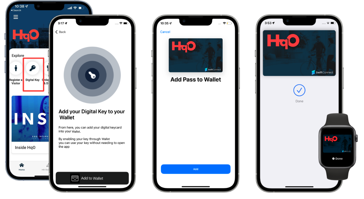 By adding SwiftConnect, you can allow users to access both their office and tenant suite via the same card in their Apple Wallet via NFC. You can also allow Android users to utilize NFC mobile access via SwiftConnect from within their HqO app.
