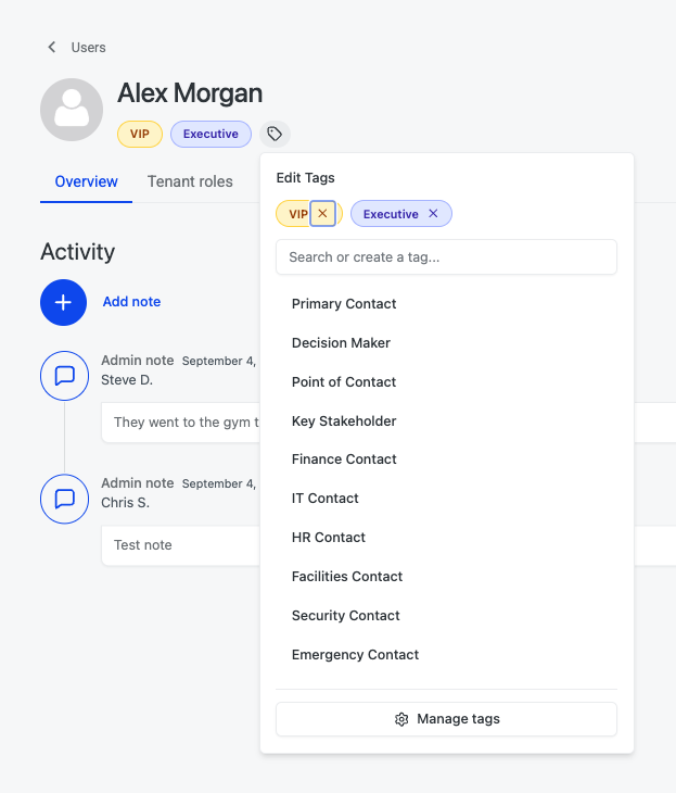 Contact Tagging is a powerful CRM feature that enables property teams to organize, categorize, and quickly identify key stakeholders, decision-makers, and important relationships across their tenant portfolio. By applying tags to tenant contacts, you empower your entire staff—from frontline concierge to property managers—with instant context about who matters, ensuring VIPs and critical stakeholders receive personalized, informed service.