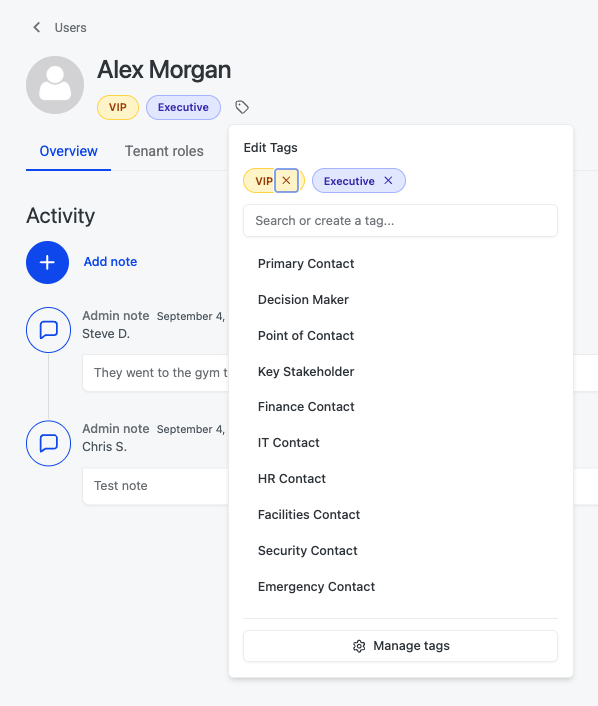 Example: Alex Morgan might display tags for "VIP" and "Executive" next to their name.