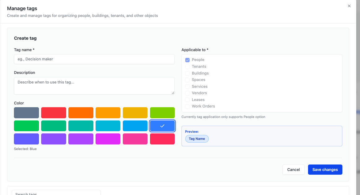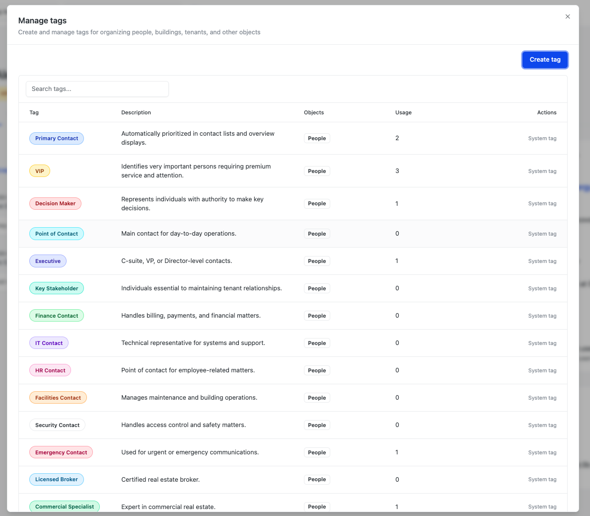 Q: Can I apply tags to tenants or buildings? A: Not yet. Currently, tags only apply to People/Users (contacts). Future releases will enable tagging across all CRM objects including tenants, buildings, spaces, and more.