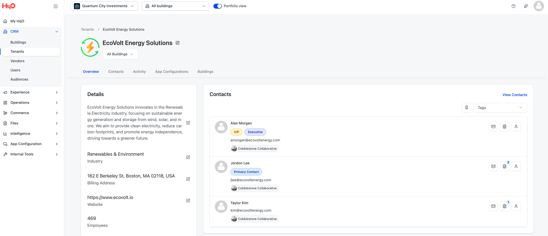 Tenant Health at a Glance - Overview cards provide instant insight into tenant details, contacts, activity, and building presence