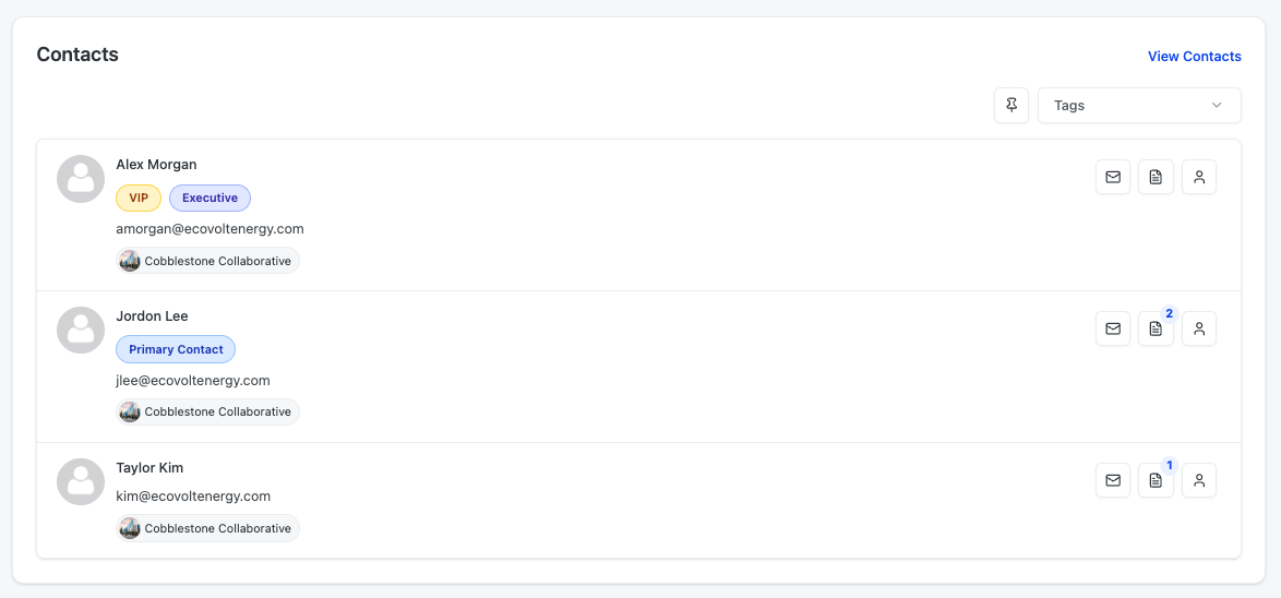 See tags applied to contacts (VIP, Executive, Primary Contact, etc.)