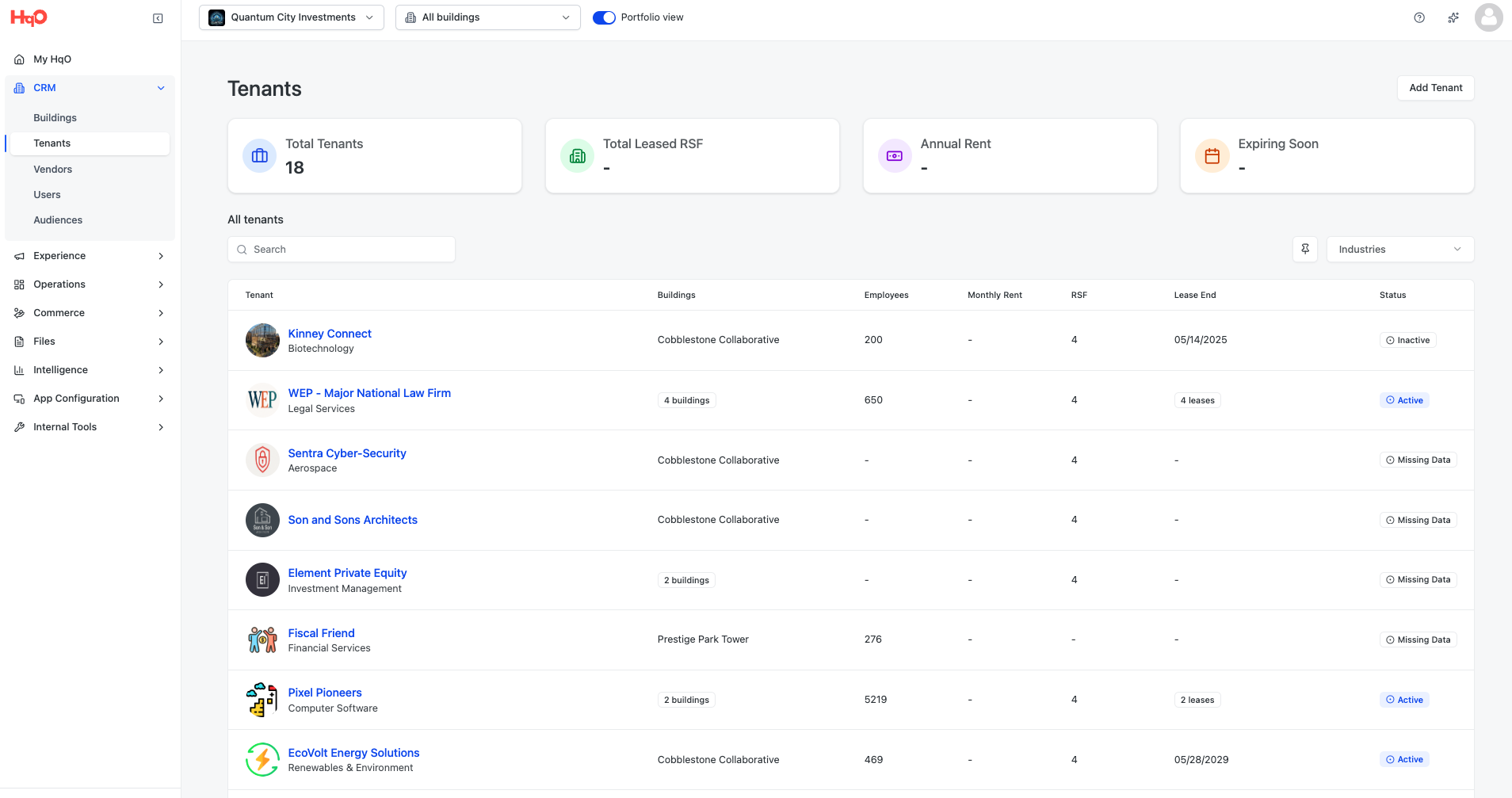Note on Data Completeness: Many existing tenant records may show empty fields or "Missing Data" status initially. This is expected—HqO hasn't historically tracked comprehensive tenant information. With these CRM capabilities now available, property teams can populate and maintain this critical data going forward.