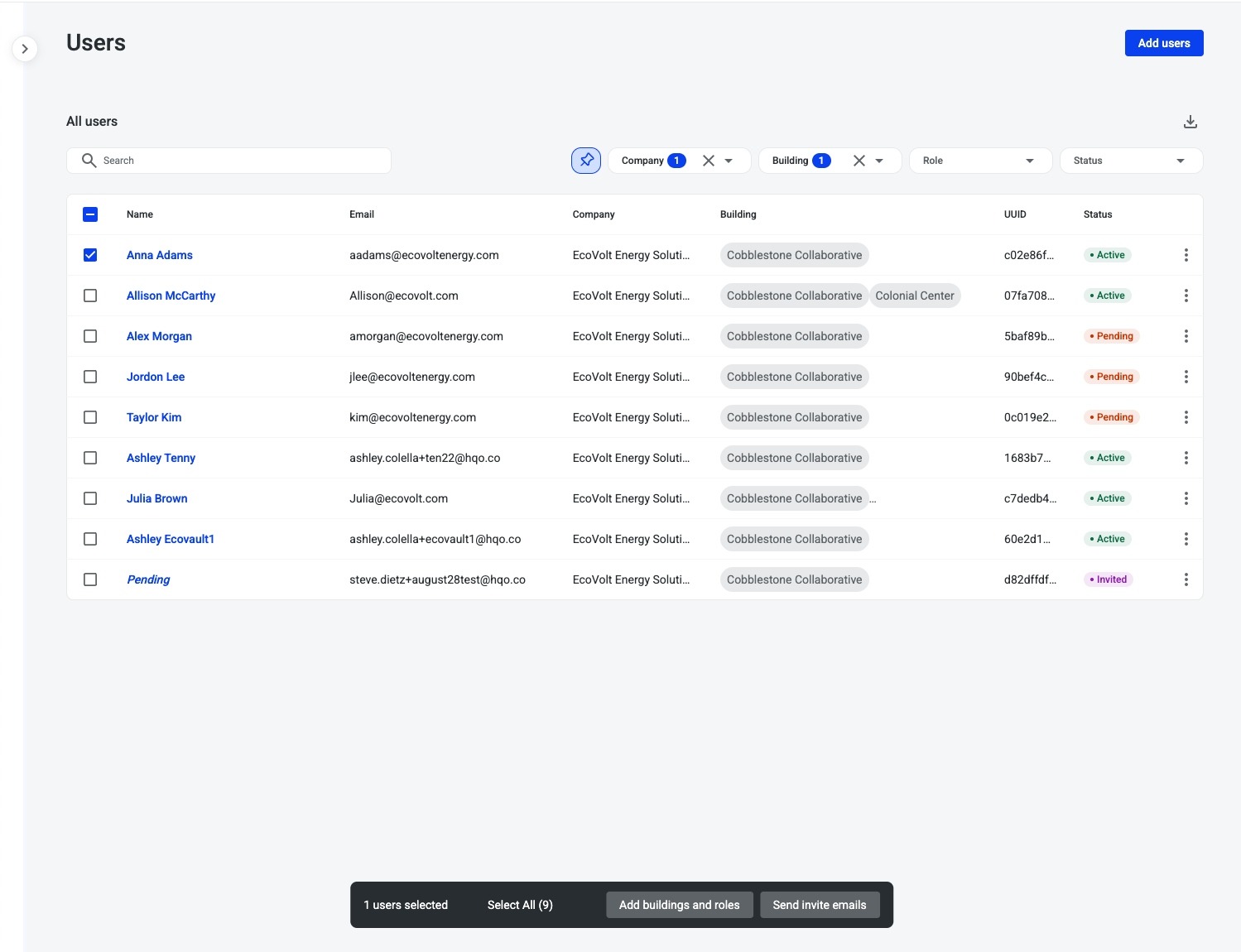 Search across all users within your building scope by name, email, or company.